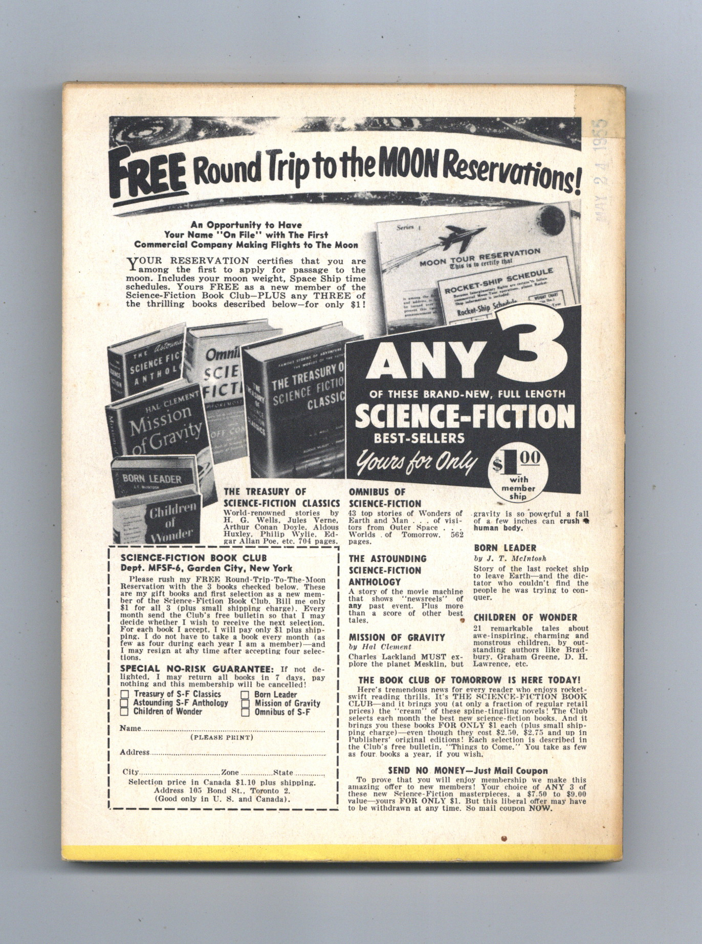 June 1955. Cover by George Salter. Science fiction stories: "You're Another" by Damon Knight, "Created He Them" by Alice Eleanor Jones, "The Soul of Laploshka" by Saki, "The Adventure of the Ball of Nostradamus" by Mack Reynolds and August Derleth, "The Faithful Friend" by Evelyn E. Smith, "Astronomy Lesson" by Willard Marsh, "Walk Like a Mountain" by Manly Wade Wellman, P.G. Wodehouse, "The New Sound" by Charles Beaumont, and "Artifact" by Chad Oliver. Softcover, 5.5-in. x 7.5-in.; 132 pages, B&W. Cover price $0.35.