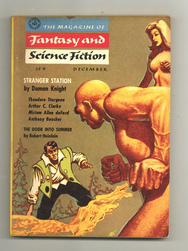 Published Dec 1956 by Mercury Publications.$20.50December 1956. Science fiction stories: "Stranger Station" by Damon Knight, "First Lesson" by Mildred Clingerman, "The Door Into Summer" (conclusion) by Robert Heinlein, "Gandolphus" by Anthony Boucher, "The Red Wagon" by Jane Roberts, "The Apotheosis of Ki" by Miriam Allen deFord, "Venture to the Moon" by Arthur C. Clarke, and "And Now in the News" by Theodore Sturgeon. Interior illustrations and cover by Kelly Freas. Softcover, 5.5-in. x 7.5-in.; 128 newsprint pages, B&W. Cover price $0.35.