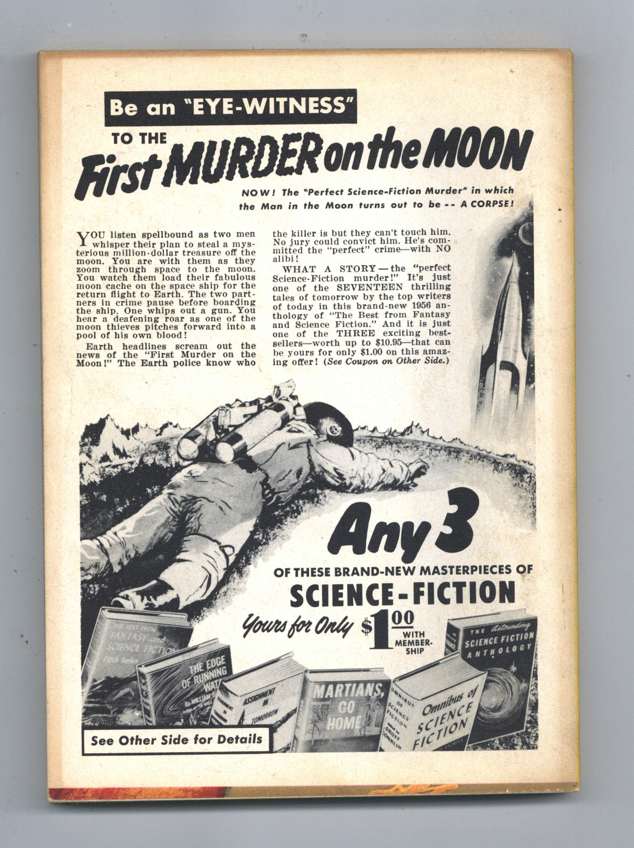 Published Dec 1956 by Mercury Publications.$16.75December 1956. Science fiction stories: "Stranger Station" by Damon Knight, "First Lesson" by Mildred Clingerman, "The Door Into Summer" (conclusion) by Robert Heinlein, "Gandolphus" by Anthony Boucher, "The Red Wagon" by Jane Roberts, "The Apotheosis of Ki" by Miriam Allen deFord, "Venture to the Moon" by Arthur C. Clarke, and "And Now in the News" by Theodore Sturgeon. Interior illustrations and cover by Kelly Freas. Softcover, 5.5-in. x 7.5-in.; 128 newsprint pages, B&W. Cover price $0.35.