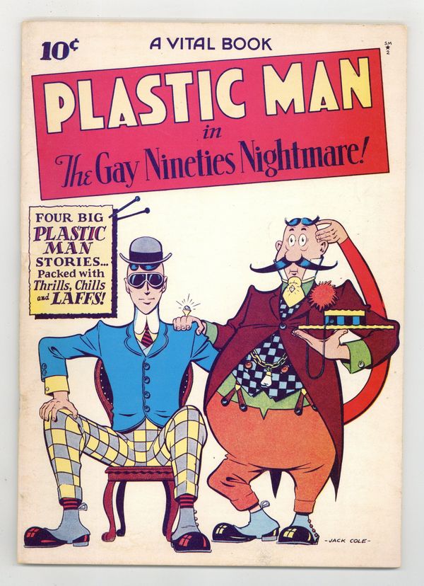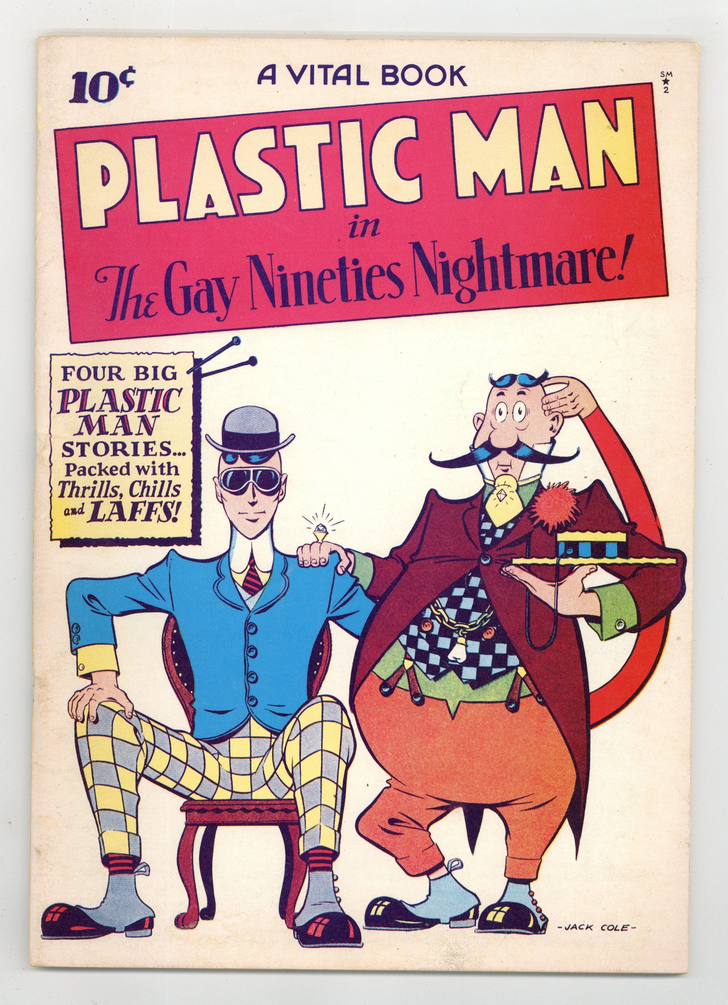 The thirty-third issue of the Flashback reprint series presents Plastic Man #2 originally published in 1944 by Vital Publications. Cover art by Jack Cole. "The Gay Nineties Nightmare" starring Plastic Man, script and art by Jack Cole; A city has been transformed to look like the gay Nineties (1890's). "Who's Who" starring Plastic Man, script and art by Jack Cole; Elmer Body has the ability to change bodies with anyone; Unfortunately for him, he chooses Woozy Winks. "The Lava Man" starring Plastic Man, script and art by Jack Cole; Fargo Freddie falls into a volcano, and turns into a Lava Man. "Welcome To Coroner's Corners!", script and art by Jack Cole; Plas and Woozy go to Coroner's Corners to try and find out why everyone has gone stark raving mad. 64-pages, full color cardstock covers, 7-3/4-in. x 10-3/8-in. black-and-white interior on white paper stock, saddle-stitched binding. Cover price $3.00.