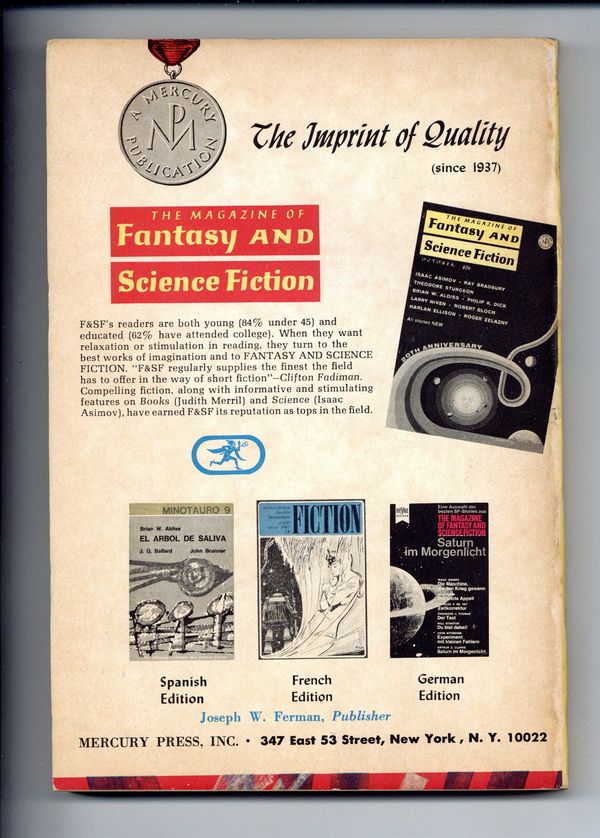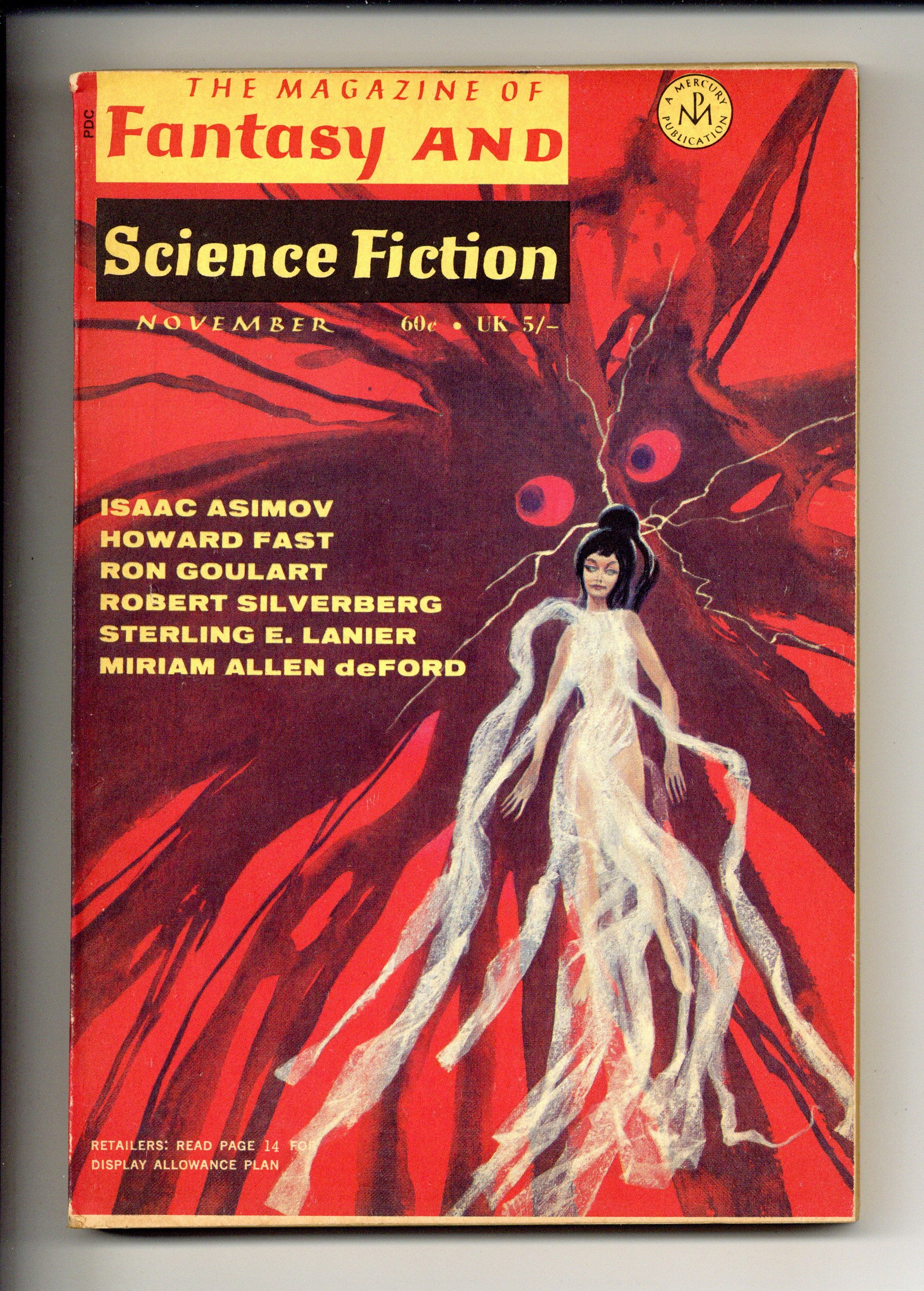 Published Nov 1969 by Mercury Publications.$4.49November 1969. Whole No. 222. Science fiction stories: "A Feminine Jurisdiction" by Sterling E. Lanier, "Diaspora" by Robin Scott, "The Mouse" by Howard Fast, "Penny Dreadful" by Ron Goulart, "The Crib Circuit" by Miriam Allen deFord, "Come Up and See Me Some Time" by Gilbert Thomas, "After the Bomb Cliches" by Bruce McAllister, and "After the Myths Went Home" by Robert Silverberg. Cartoon by Gahan Wilson. Science article by Isaac Asimov. Short reviews of Michael Crichton's "The Andromeda Strain" and Ursula K. LeGuin's "The Left Hand of Darkness" Cover by Jack Gaughan. Softcover, 5-in. x 7-in., 130 newsprint pages, B&W. Cover price $0.60.