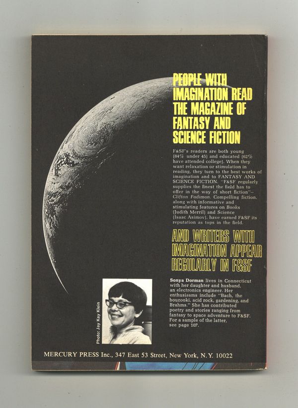 Published Nov 1970 by Mercury Publications.$14.00November 197. Whole number 234. Cover by Jack Gaughan. Science fiction stories: "The Throne and the Usurper" by Christopher Anvil, "Alpha Bets" by Sonya Dorman, "The Mayday" by Keith Roberts, "Starting From Scratch" by Robert Sheckley, "The Misfortune Cookie" by Charles E. Fritch, and "Time Dog" by Richard A. Lupoff. Reprint feature, "The Venus of Ille" by Prosper Merimee. Cartoon by Gahan Wilson. Science article by Isaac Asimov. Softcover, 5-in. x 7-in., 130 newsprint pages, B&W. Cover price $0.60.