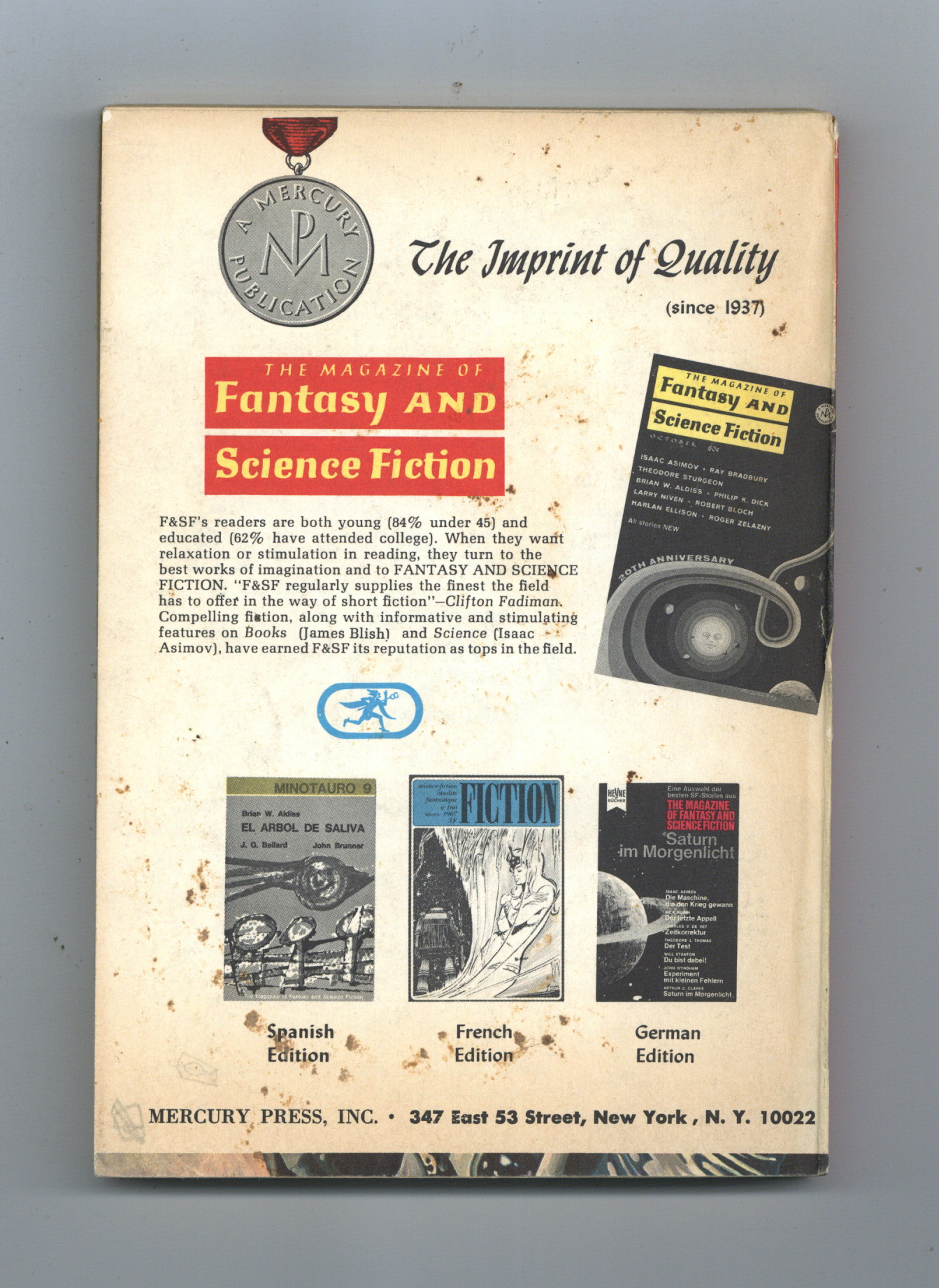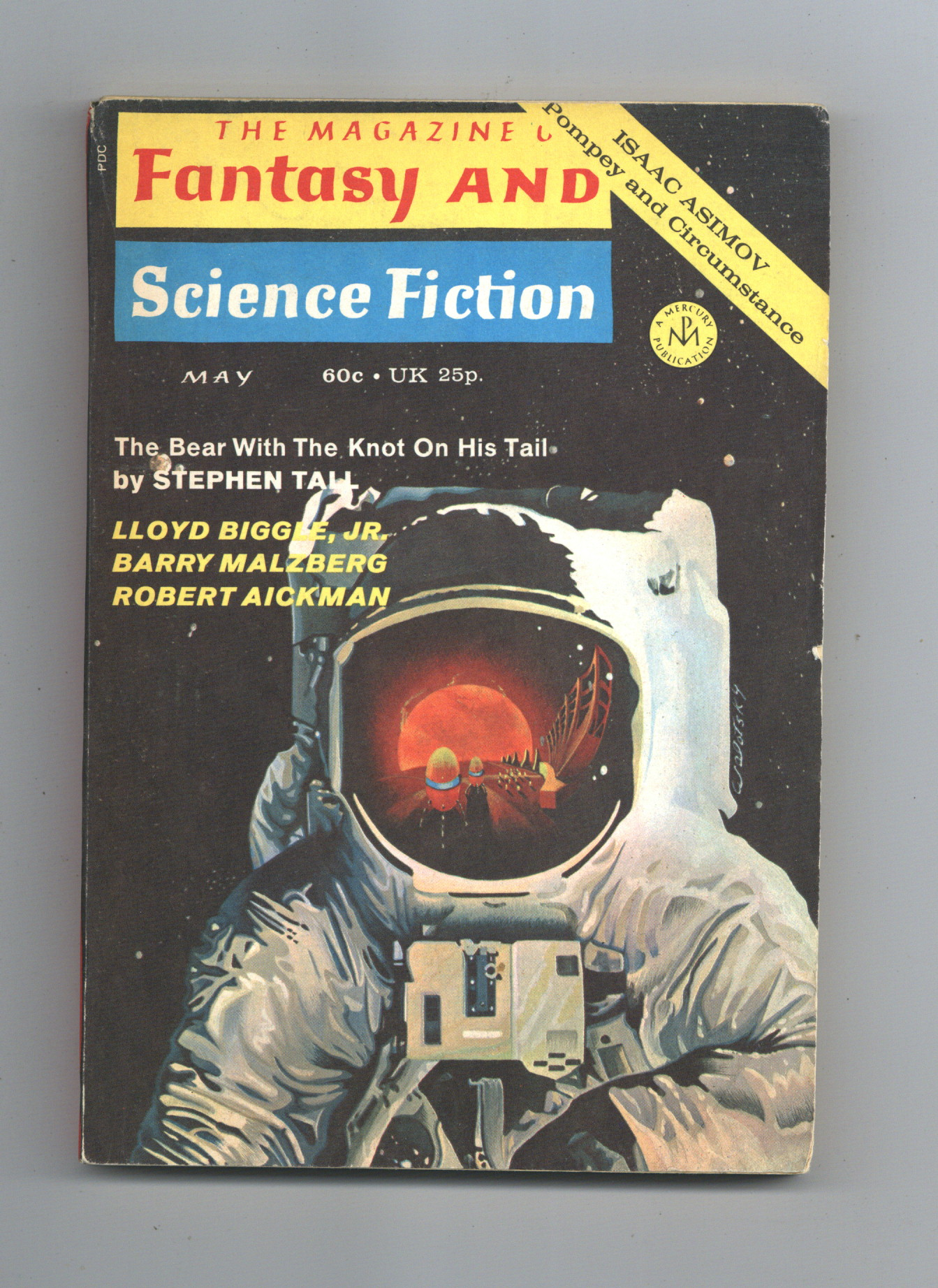 Published May 1971 by Mercury Publications.$3.60May 1971; whole number 240. Science fiction stories: "The Bear With the Knot on His Tail" by Stephen Tall, "Ringing the Changes" by Robert Aickman, "A Free Pass to the Carnival" by George Alec Effinger, "If Something Begins" by Raylyn Moore, "Her Lover's Name Was Death" by Edward Bryant, "The Frayed String on the Stretched Forefinger of Time" by Lloyd Biggle Jr., and "Yearbook" by Barry N. Malzberg. Cartoon by Gahan Wilson. Science article by Isaac Asimov. Cover by Roland Walotsky. 5-in. x 7-in., black and white; 128 pages. Cover price $0.60.