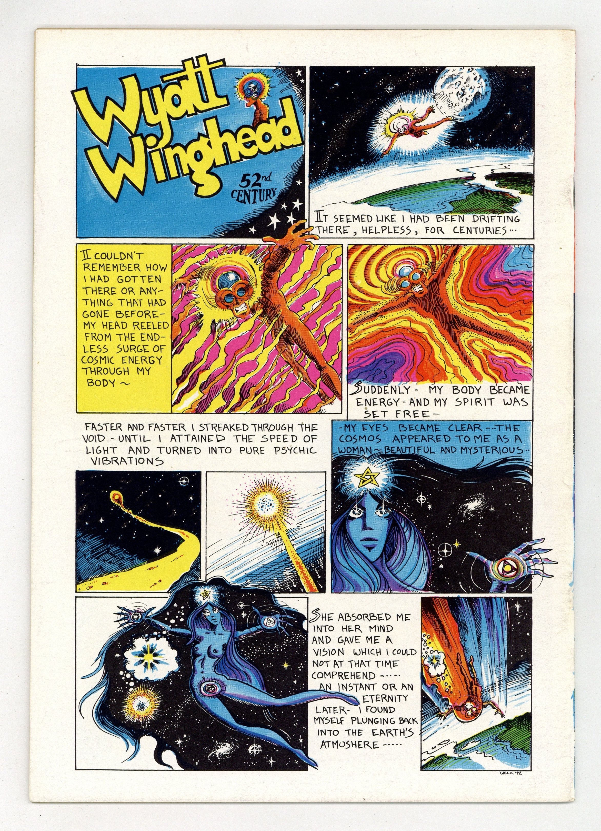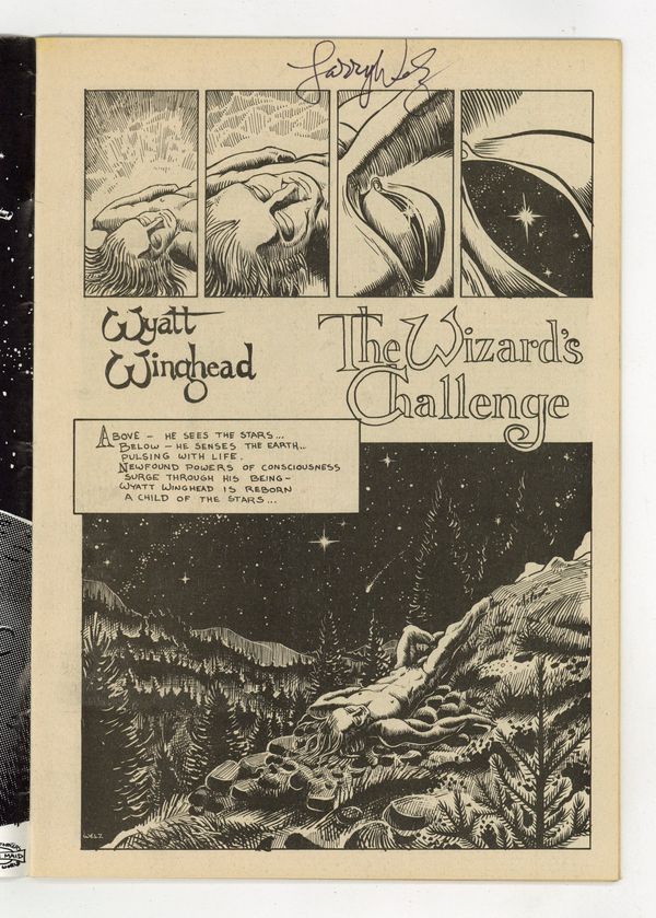 Copyright 1971. Semi-pro comic art, generally better quality. Larry Sutherland, Larry Welz, & Larry Todd. The Right On Squad, The Holy Five, The Cosmos; slick cover; b&w; 36 pages; mature; 6 3/4-in. x 9 3/4-in. Cover price $0.50.