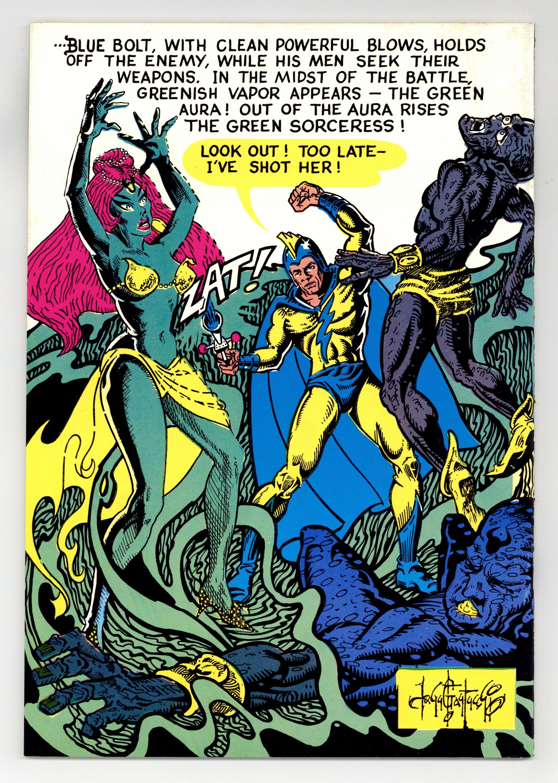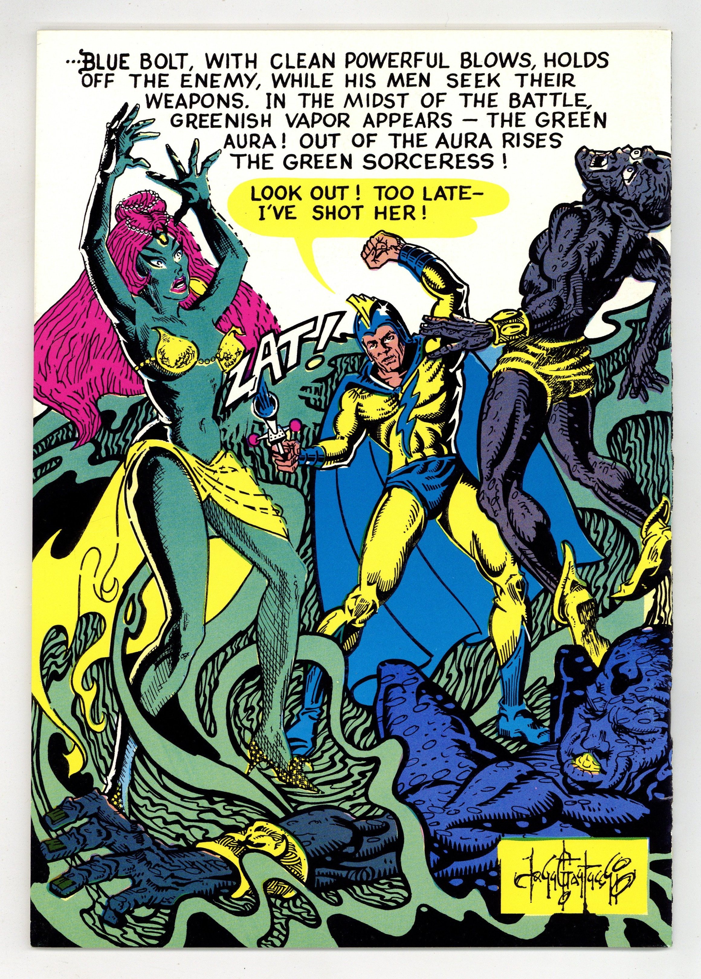 $21.00Volume III. Capsule histories of Golden Age heroes. Research and art by Raymond Miller. Front cover: Green Hornet by Biljo White. Back cover: Blue Bolt by John Fantucchio. Early fanzine in the tradition of "Official Handbook of the Marvel Universe" & "Who's Who in the DC Universe". Raymond draws over 50 heroes from all publishers and provides a brief capsulated history for each one. Captain Terror, Kitty Kelly, Blackhawk, Mr. Satan, Aquaman, Namora, Green Turtle, The Steel Fist, etc.; 40 pages; b&w; 7-in. x 10 1/8-in. The original 1968 edition, not a reprint. Published in 1968 by G.B. Love of RBCC, Rocket's Blast-Comic Collector. Cover price $1.50.