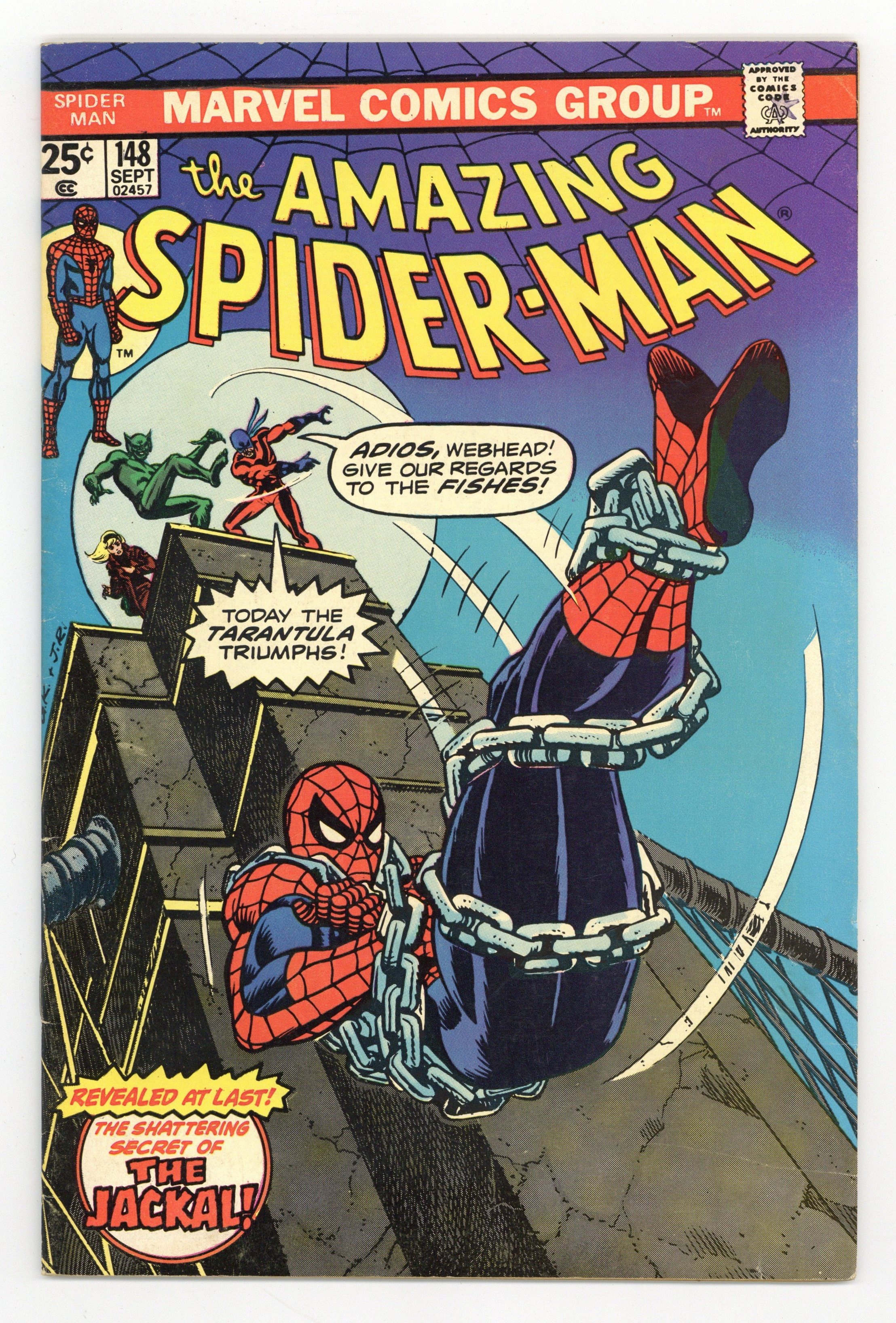 Mark Jeweler Advertisement Insert Variant. The Gwen Stacy clone story continues in "Jackal, Jackal, Who's Got the Jackal?" Script by Gerry Conway, pencils by Ross Andru, inks by Mike Esposito and Dave Hunt. The Jackal is revealed to be Professor Warren. Gil Kane/John Romita Sr. cover. Reprinted in Marvel Tales # 125. Letter to the editor from Dean Mullaney (Eclipse Comics). Cover price $0.25.