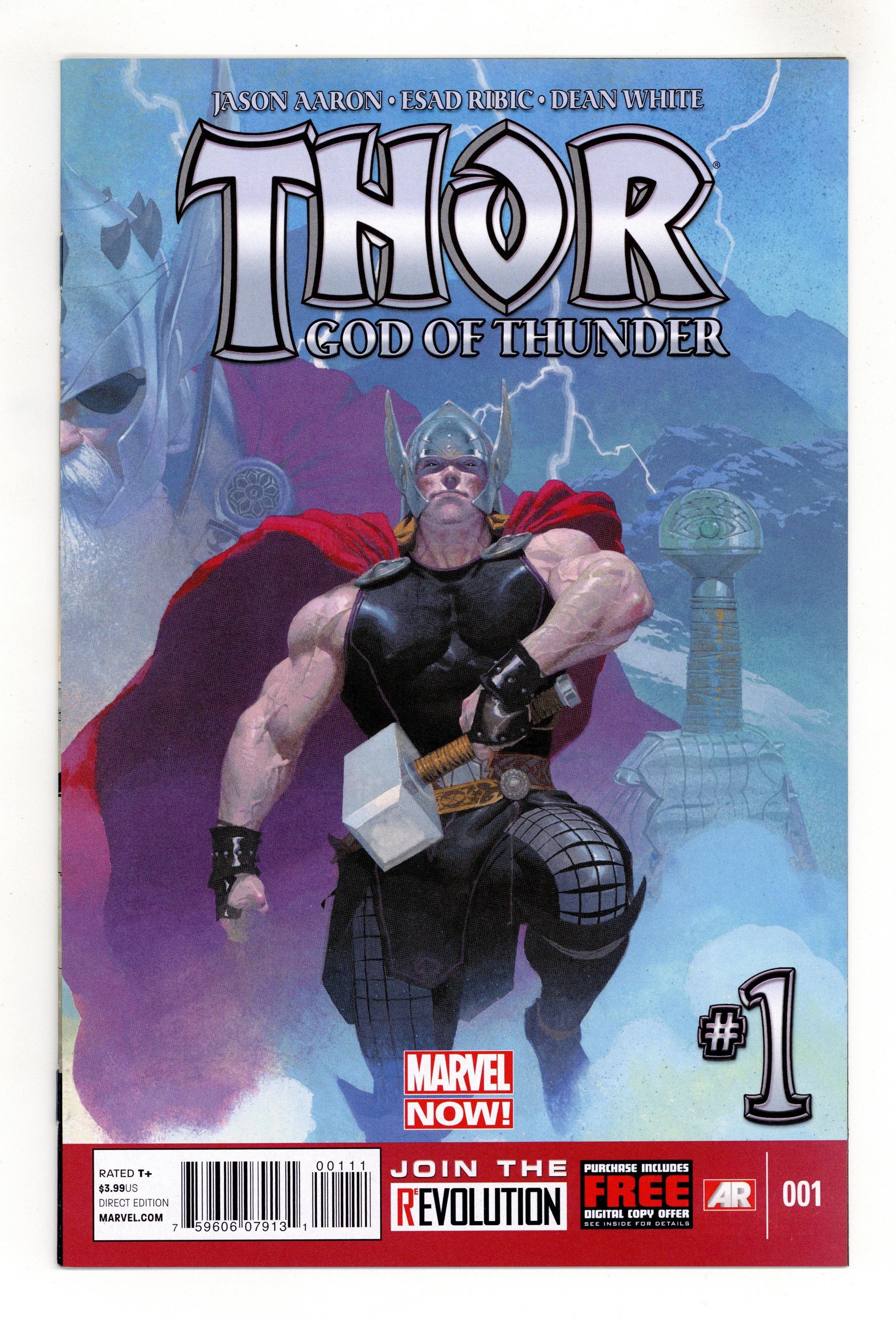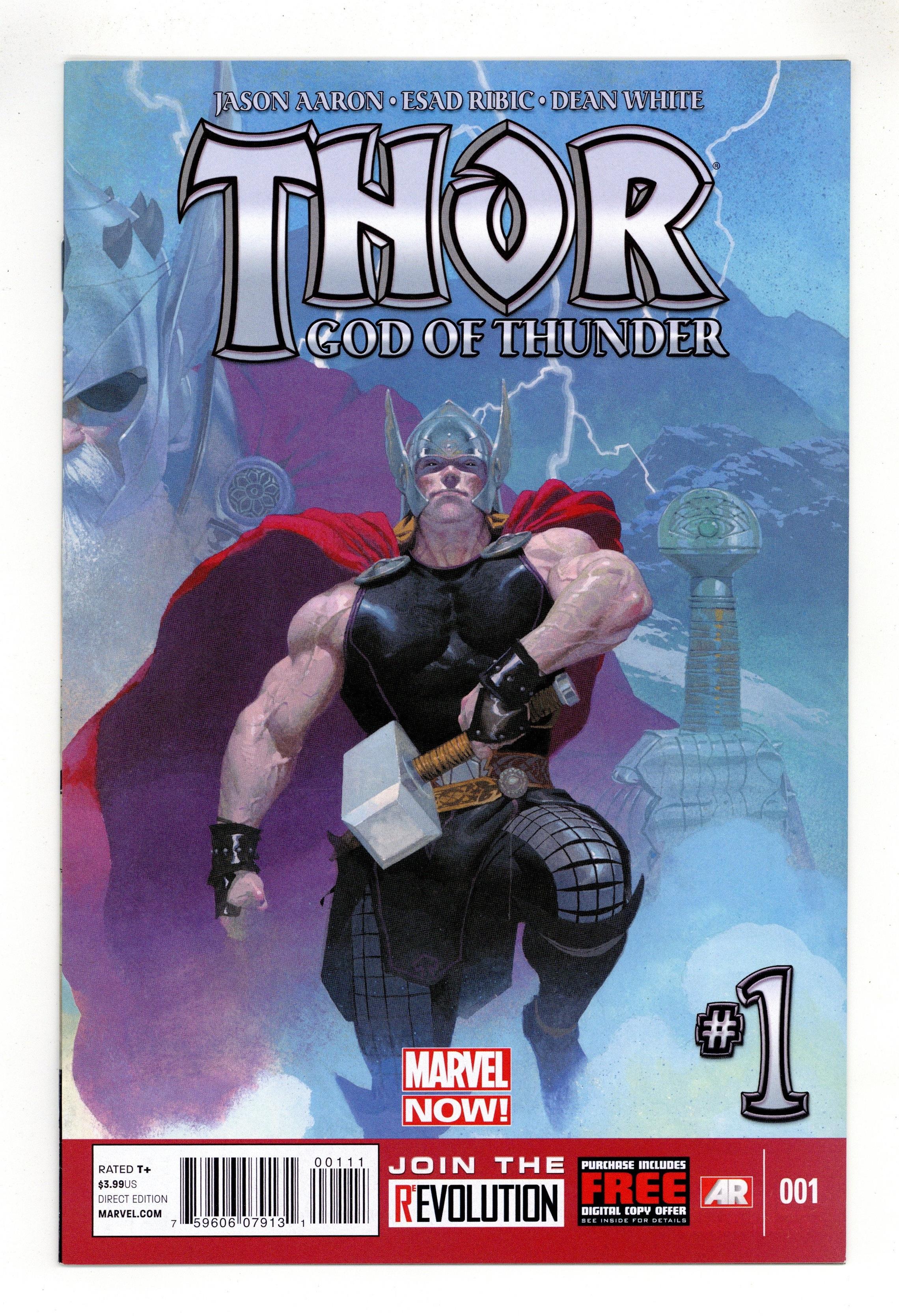 (W) Jason Aaron (A) Esad Ribic Throughout the ages, the gods of the Marvel Universe have been vanishing, their mortal worshippers left in chaos. NOW! the Mighty Thor follows a trail of blood that threatens to consume his past, present and future selves. The only hope for these ravaged worlds lies with the God of Thunder unraveling the gruesome mystery of the God Butcher! Cover price $3.99.