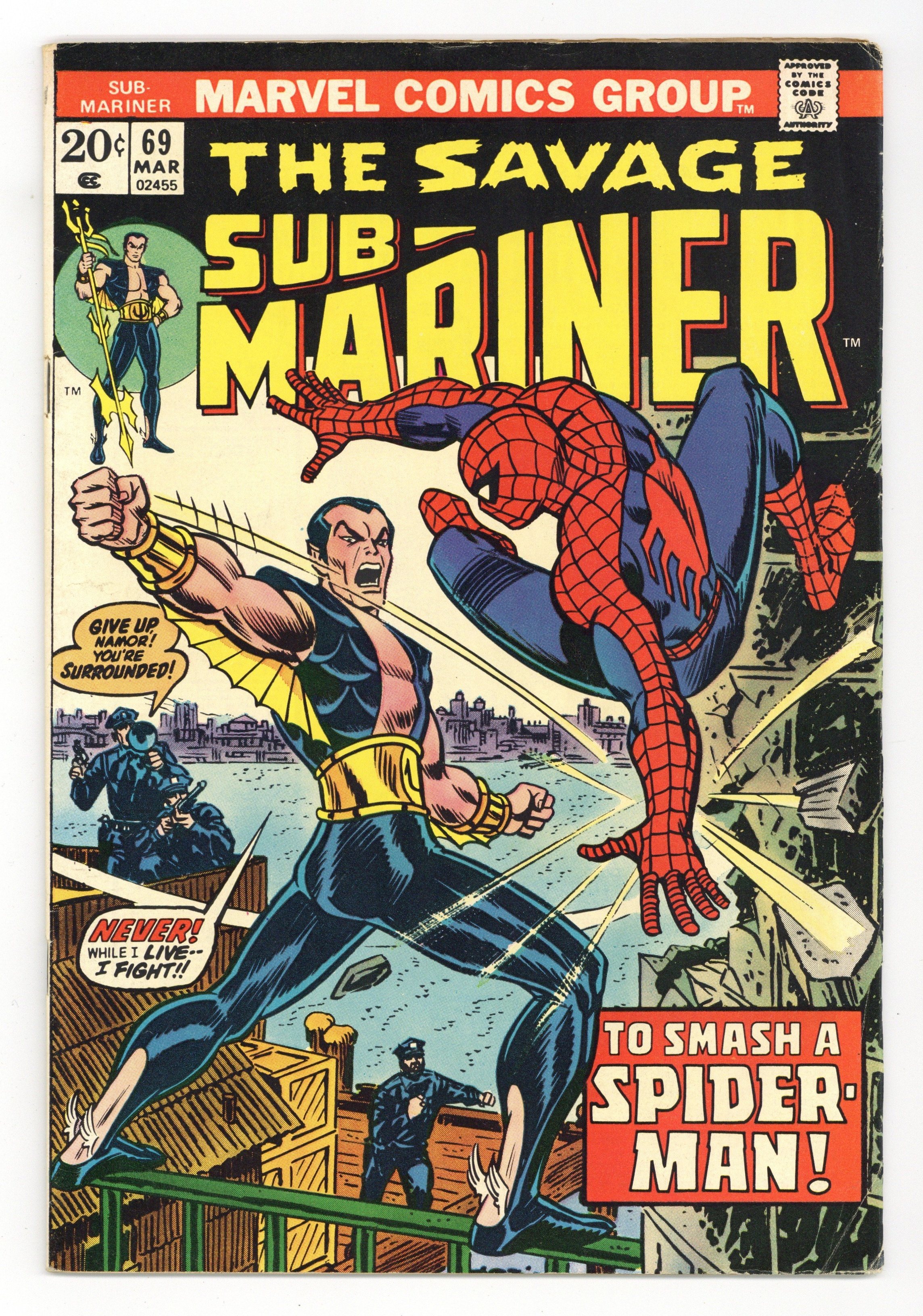 Mark Jeweler Advertisement Insert Variant. Two Worlds and Dark Destiny! Guest-starring Spider-Man. Script by Steve Gerber. Pencils by George Tuska. Inks by Vince Colletta. Cover by John Romita. The Avenging Son rampages through Empire State University! Why? Because hes trying to locate an ESU professor that can save Atlantis and her comatose citizens! But a certain web-slinging student isnt fond of Prince Namor wrecking his favorite campus! Once Spider-Man corrals the Sub-Mariner, he directs the Prince of Atlantis to the right place! And there the Avenging Son learns that he must find and defeat Force (again) to protect his undersea kingdom! Imperious Rex! Last 20¢ issue. Cameo appearances by Doctor Strange, Namorita, and Tamara. Flashback cameo by Orka. (Notes: Spider-Man and the Sub-Mariner meet again in Amazing Spider-Man 211. Force returns in Iron Man 140. The letters page contains Marvel Value Stamp series A #20 Brother Voodoo. The bullpen bonus page contains promotional stamp #5 the Hulk. The promotional stamp is not to be confused with the actual series A stamp #5.) 32 pages. Cover price $0.20.