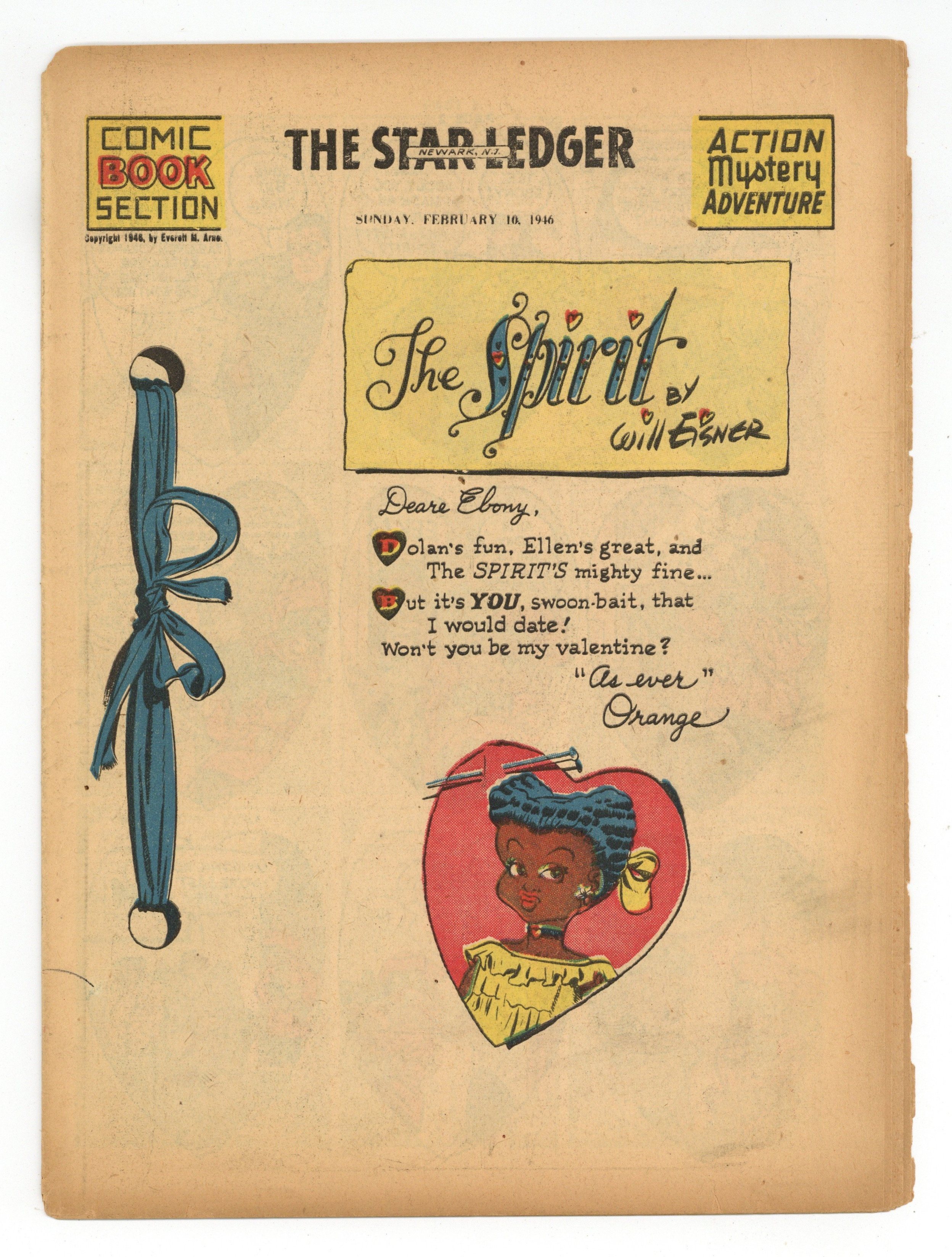 Spirit Weekly Newspaper Comic Insert. 7-1/2 x 10 inches, 16 pages, full color, all newsprint with no slick cover. Scripts/layouts by Eisner, Eisner/Nordling, Eisner/Mercer, or Spranger/Eisner; inks by Eisner or Eisner/Spranger.