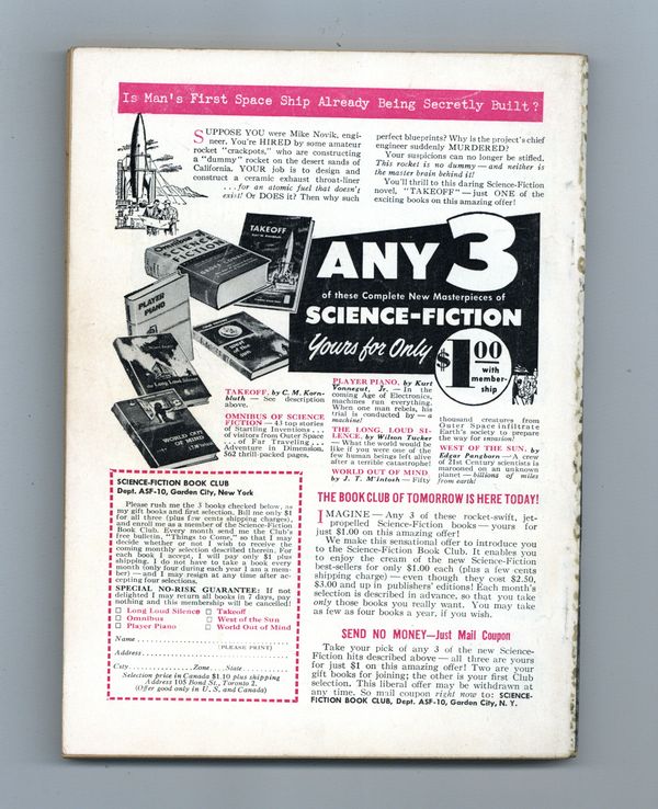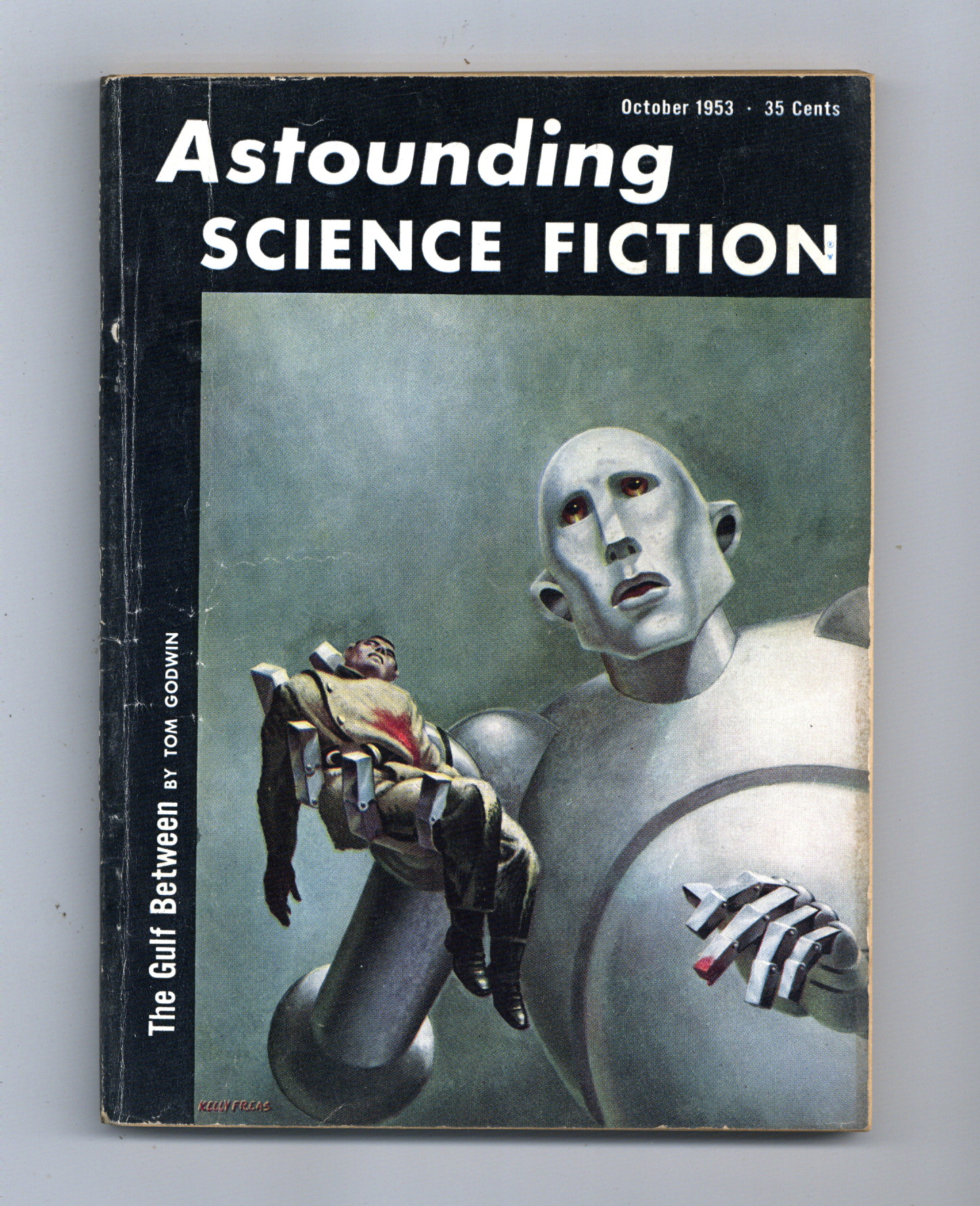 Published Oct 1953 by Street & Smith.$48.00Oct 1953. Volume 52, Issue 2 - 1st printing. Cover by Frank Kelly Freas. Science fiction stories by Tom Godwin, Isaac Asimov, Ralph Williams, James White, and G.R. Shipman. Article on filming "The War of the Worlds" by George Pal. Illustrations by Kelly Freas, Kirberger, Miller, and Dangen. Softcover, 5 1/2-in. x 7 1/2-in., 162 pages, B&W. Cover price $0.35.
