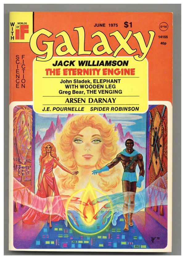 Published Jun 1975 by Galaxy Publications.$18.00Science fiction stories: "The Eternity Engine" by Jack Williamson, "The Venging" by Greg Bear, "Elephant with Wooden Leg" by John Sladek, "Let Darkness Fall" by Hartmann, "The Yidam" by Herbie Brennan, and "Helium" (part 2) by Arsen Darnay. Illustrations by Jack Gaughan, Freff, and Wendy Pini. Cover by Wendy Pini. 5-1/8 in. x 7-5/8 in.; black and white; 160 newsprint pages. Cover price $1.00.