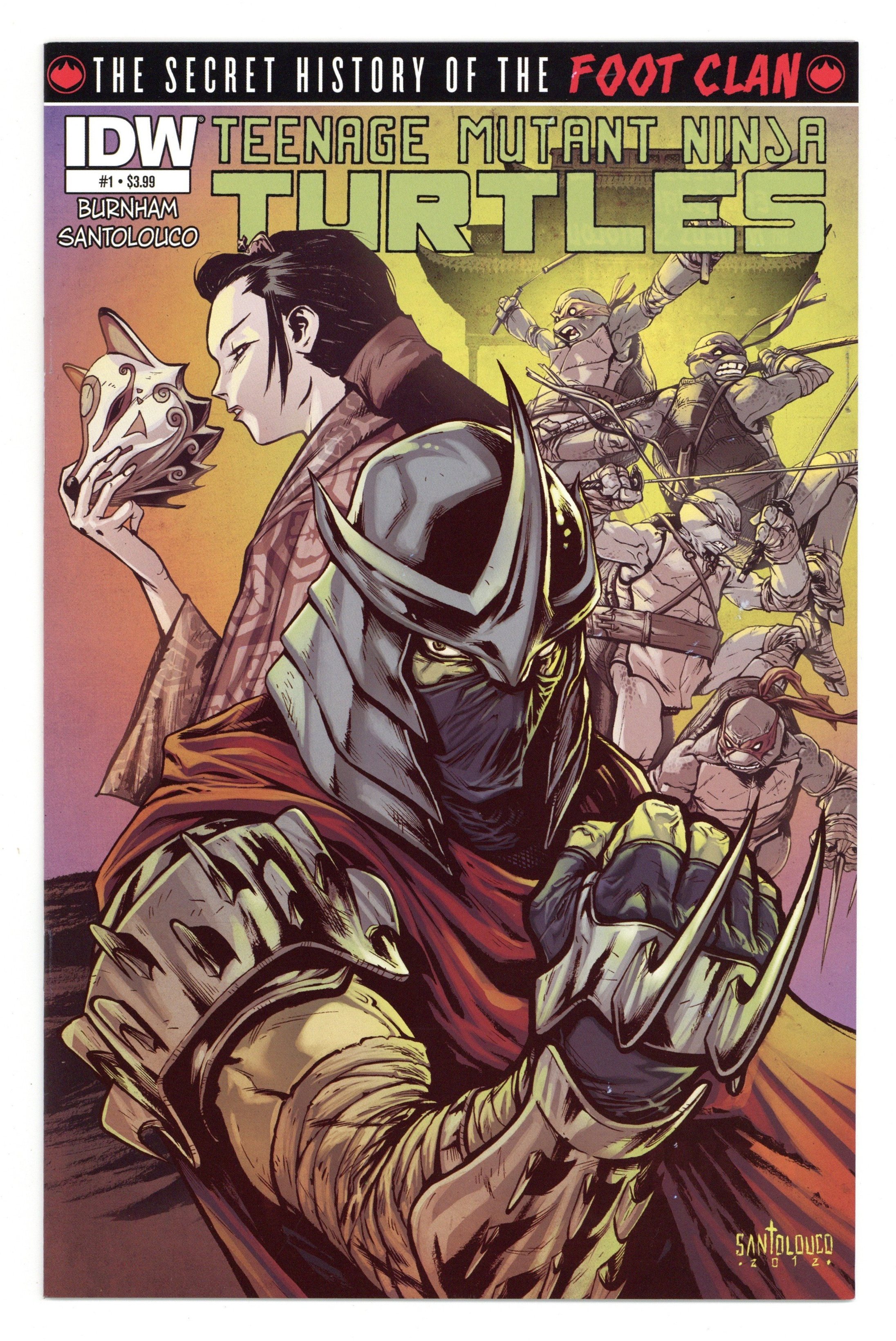 Published Dec 2012 by IDW Publishing.$15.00Cover by Mateus Santolouco (W) Mateus Santolouco, Erik Burnham (A) Mateus Santolouco Demons, ninjas, and hostile takeovers-what more can you expect from a TMNT comic? The first installment of this new miniseries reveals a history never told before about the original founder of the Foot. Join the Turtles as they get a history lesson that they will never forget! Cover price $3.99.