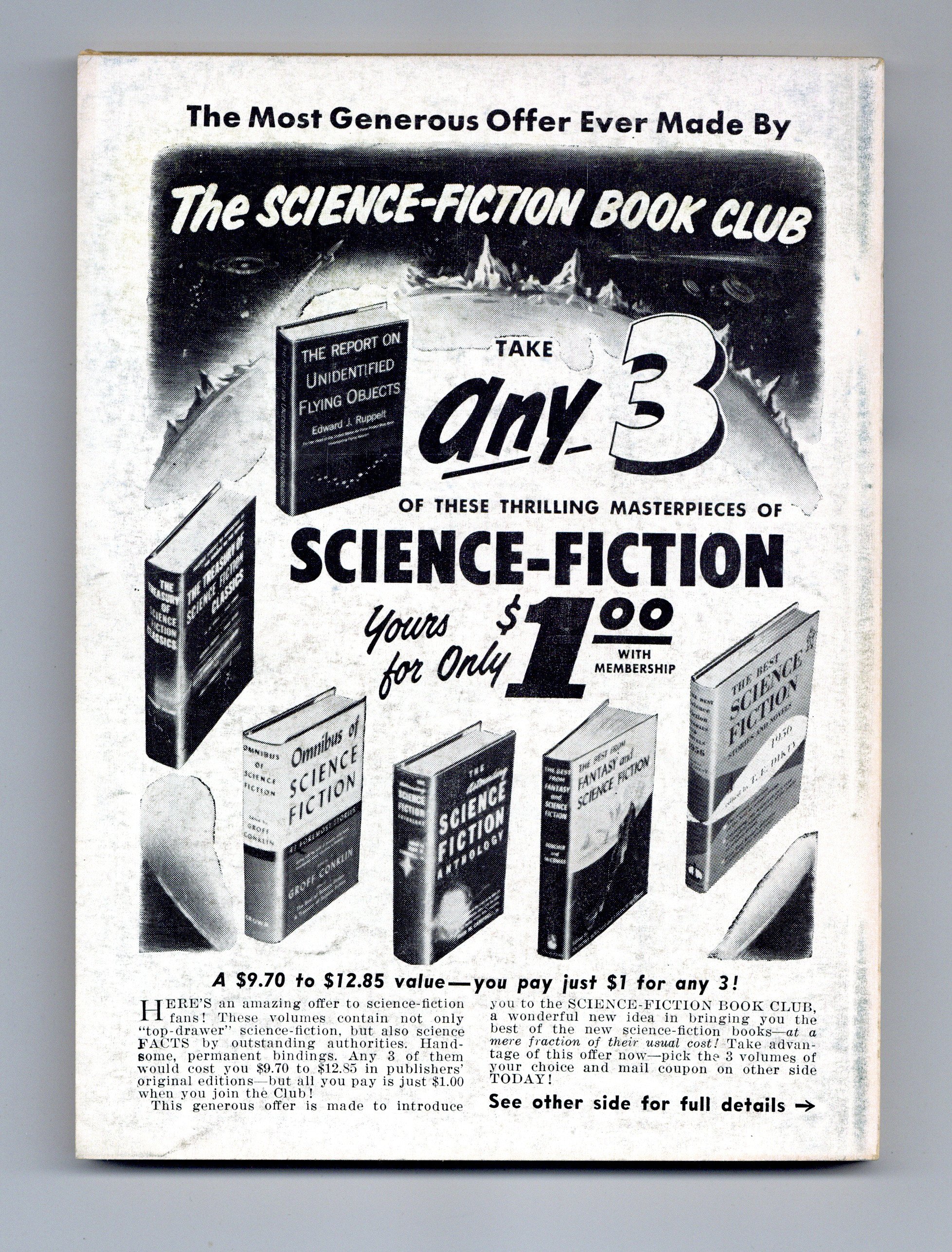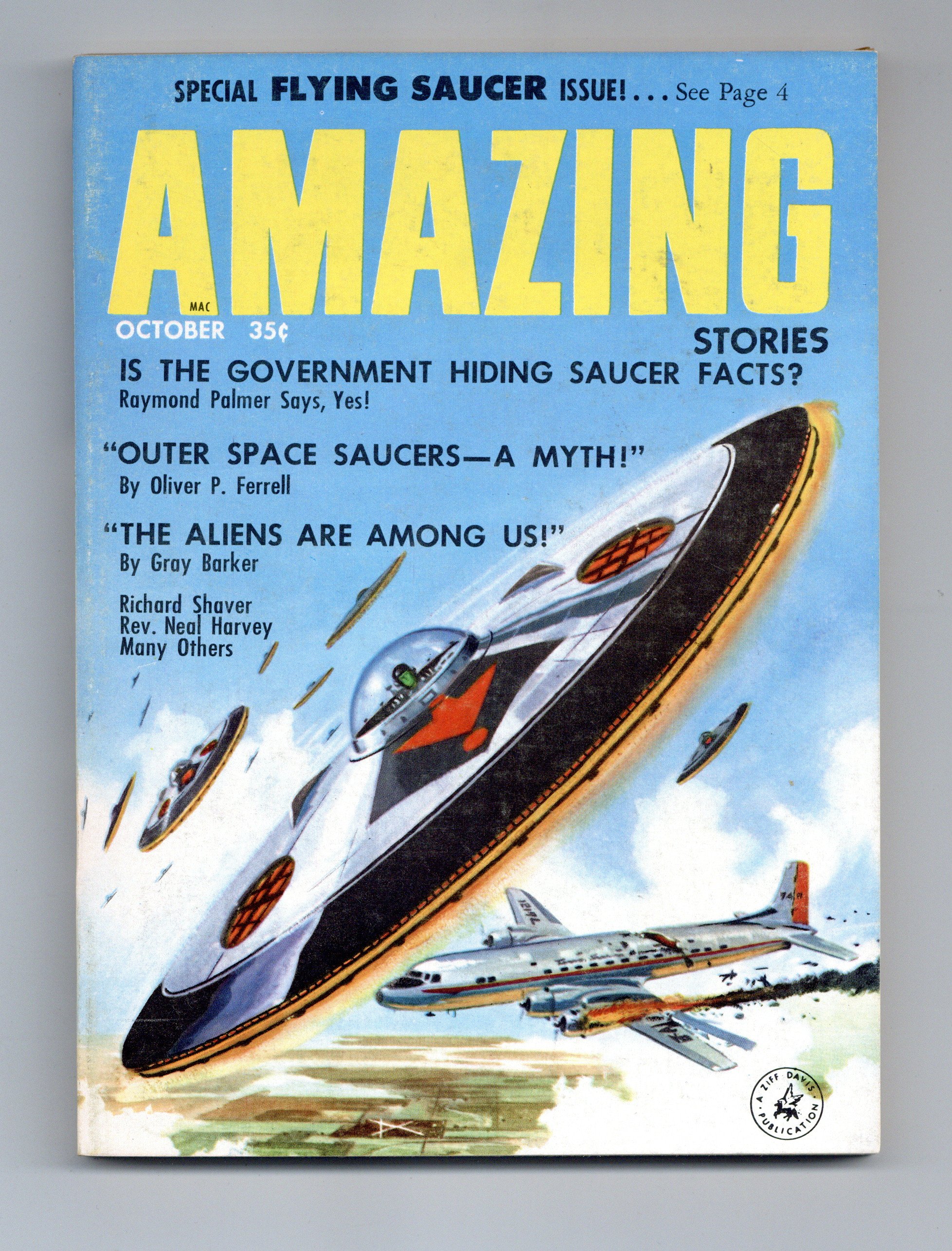 Published Oct 1957 by Experimenter Publications.$77.00Oct 1957. Special Flying Saucer Issue! UFO themed stories by Gordon Javlyn and Harlan Ellison (as "Ellis Hart"). Flying Saucer special features by Raymond Palmer, Kenneth Arnold, Gray Barker, Richard S. Shaver, Oliver P. Ferrell, Mary Grabkowicz, and Rev. Neal Harvey. Ed Sullivan illustration. Cover by Edward Valigursky. 5-1/2 in. x 7-1/2 in.; black and white; 130 newsprint pages. Cover price $0.35.