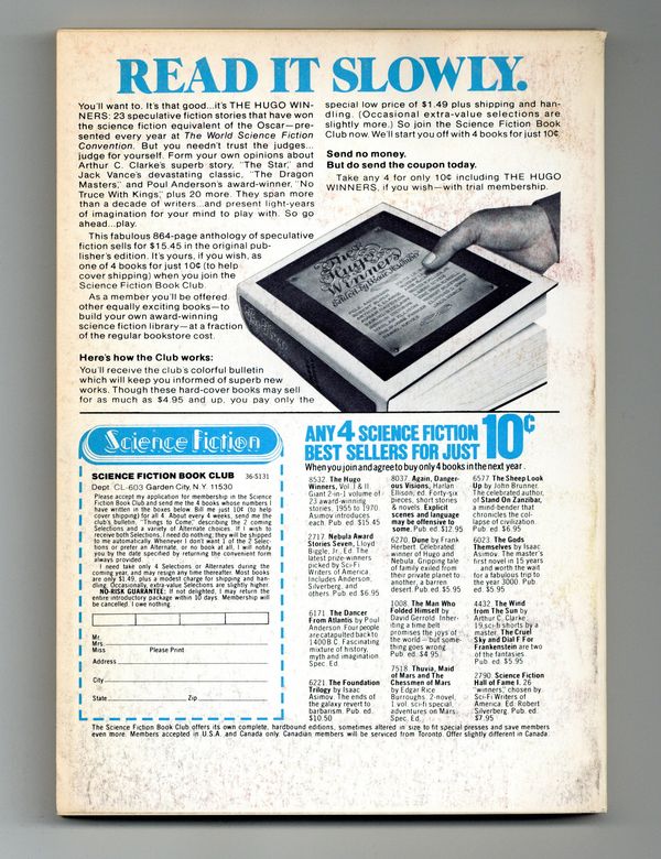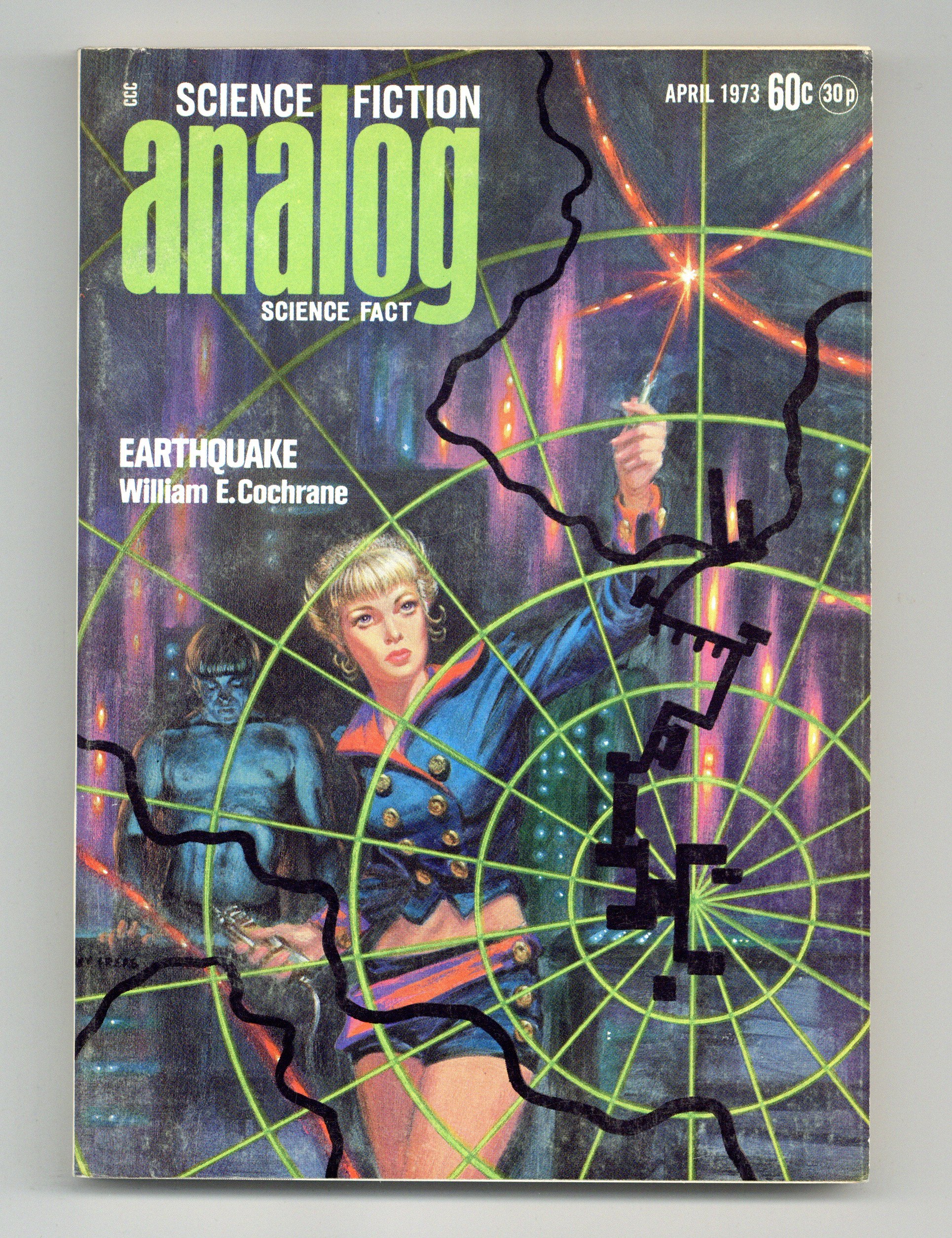 Published Apr 1973 by Dell Magazines.$2.65April 1973. Volume Misprinted as XCII, should be XCI. Cover by Frank Kelly Freas. Stories: "The People of the Wind"(Conclusion) by Poul Anderson, "Earthquake" by William E. Cochrane, "Moon Rocks" by Tom Purdom, "Not Polluted Enough" by G. H. Scithers, and "Polimander's Man-Thing" by Pat de Graw. Science Fact article: "Paraphysics and Parapsychology" by James Benjamin Beal. Softcover, 5.5-in. x 7.5-in.; 178 newsprint pages, B&W. Cover price $0.60.