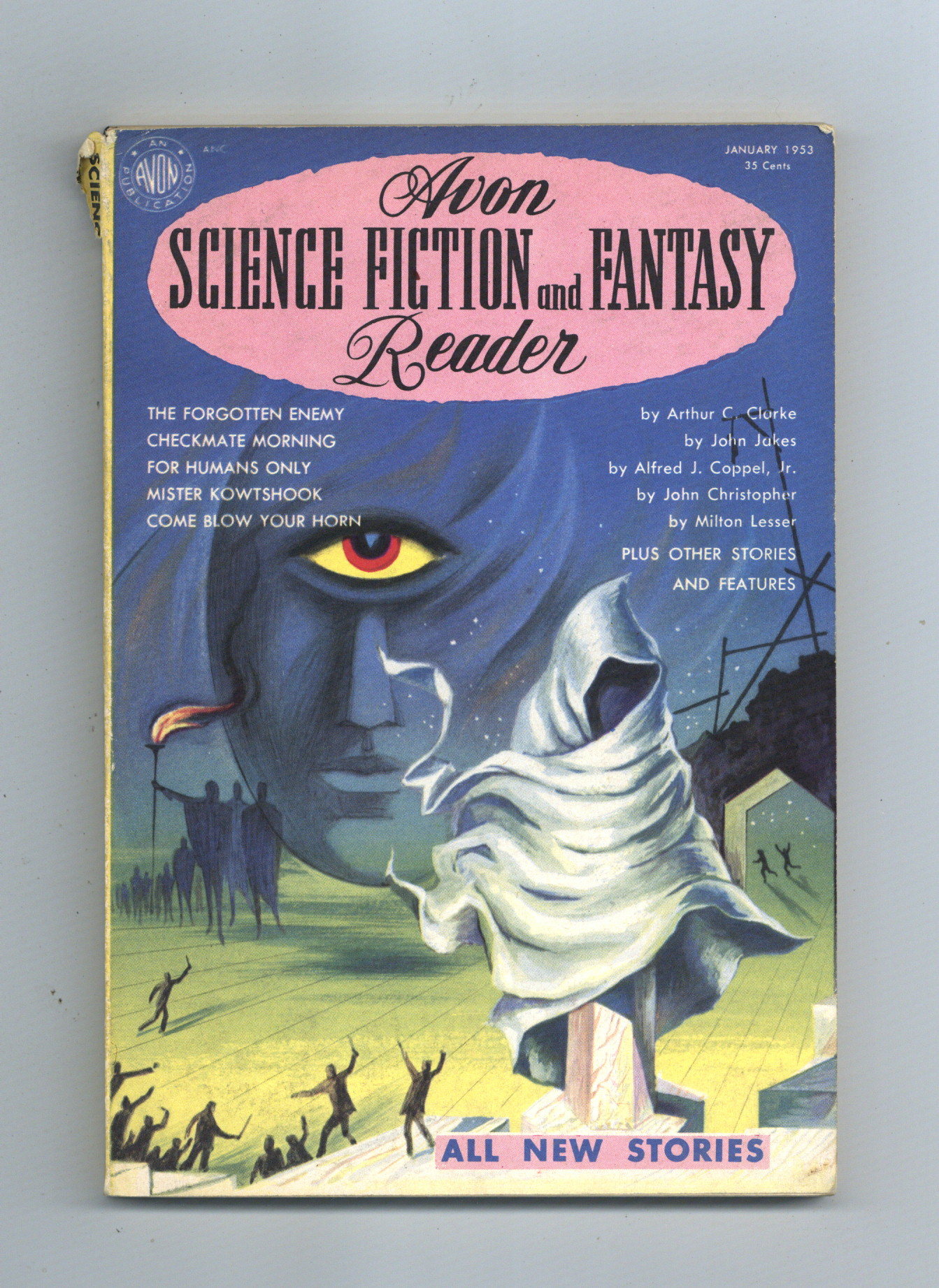 Volume 1, Issue 1 - January, 1953. Volume 1 No. 1. Cover by Leo Manso. Science Fiction and Fantasy stories by Alfred Coppel, Irving Cox, Jr., Arthur C. Clarke, Bryce Walton, John Christopher, E. Everett Evans, Milton Lesser, Charles L. Harness, Glen Malin, John Jakes, Frank Owen, and Theodore R. Cogswell. Illustrations by Everett Raymond Kinstler, John Giunta, Vincent Napoli, Gerald McCann, and Mort Lawrence. 5 1/4-in. x 7 1/2-in.; b&w text with spot illustrations; 128 newsprint pages. Cover price $0.35.