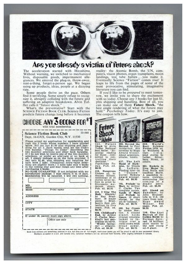 April 1971. Cover by Jack Gaughan. Science fiction stories by Joe W. Halderman, Duncan Lunan, Gordon Eklund, Robert Silverberg's "A Time of Changes" Part 2, Theodore Sturgeon, Ernest Taves, and J. R. Pierce. 5-1/4-in. x 7-1/4-in.; b&w text with spot illustrations; 192 newsprint pages. Cover price $0.75.