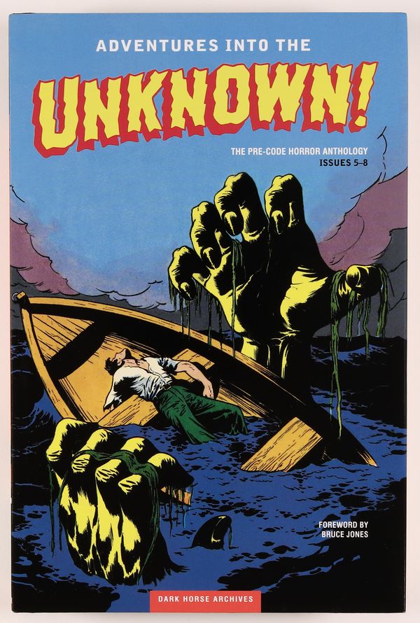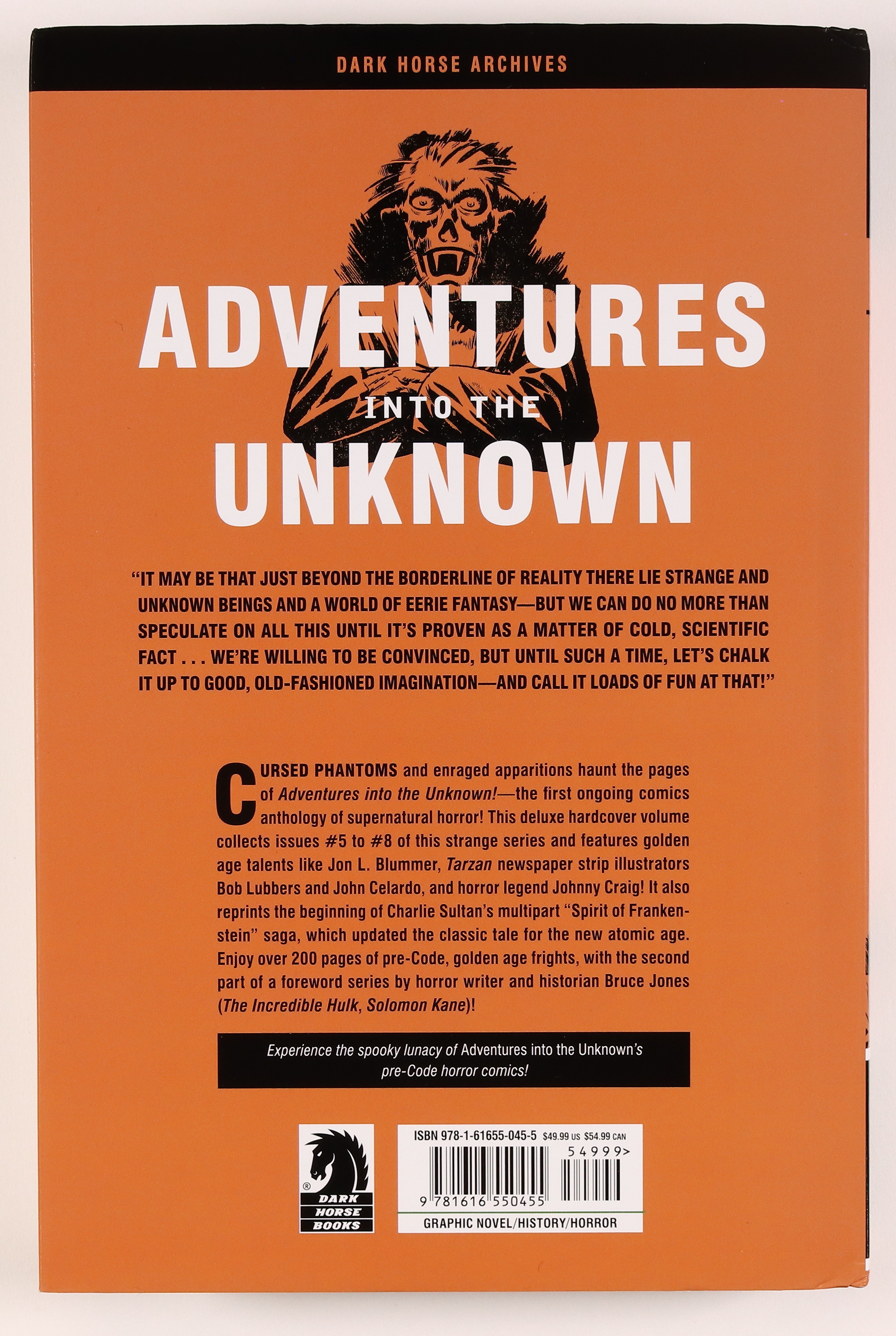 Volume 2 - 1st printing. Collects Adventures into the Unknown (1948-1967 ACG) #5-8. Written by Richard E. Hughes. Art by Johnny Craig. Foreword by Bruce Jones. Cursed phantoms and enraged apparitions haunt the pages of Adventures into the Unknown!-the first ongoing comics anthology of supernatural horror! Dark Horse's deluxe hardcover collects issues #5-#8 of this strange series. Featuring Golden Age talents like Jon L. Blummer, Tarzan newspaper strip illustrators Bob Lubbers and John Celardo, and horror legend Johnny Craig. Hardcover, 224 pages, full color. Cover price $49.99.