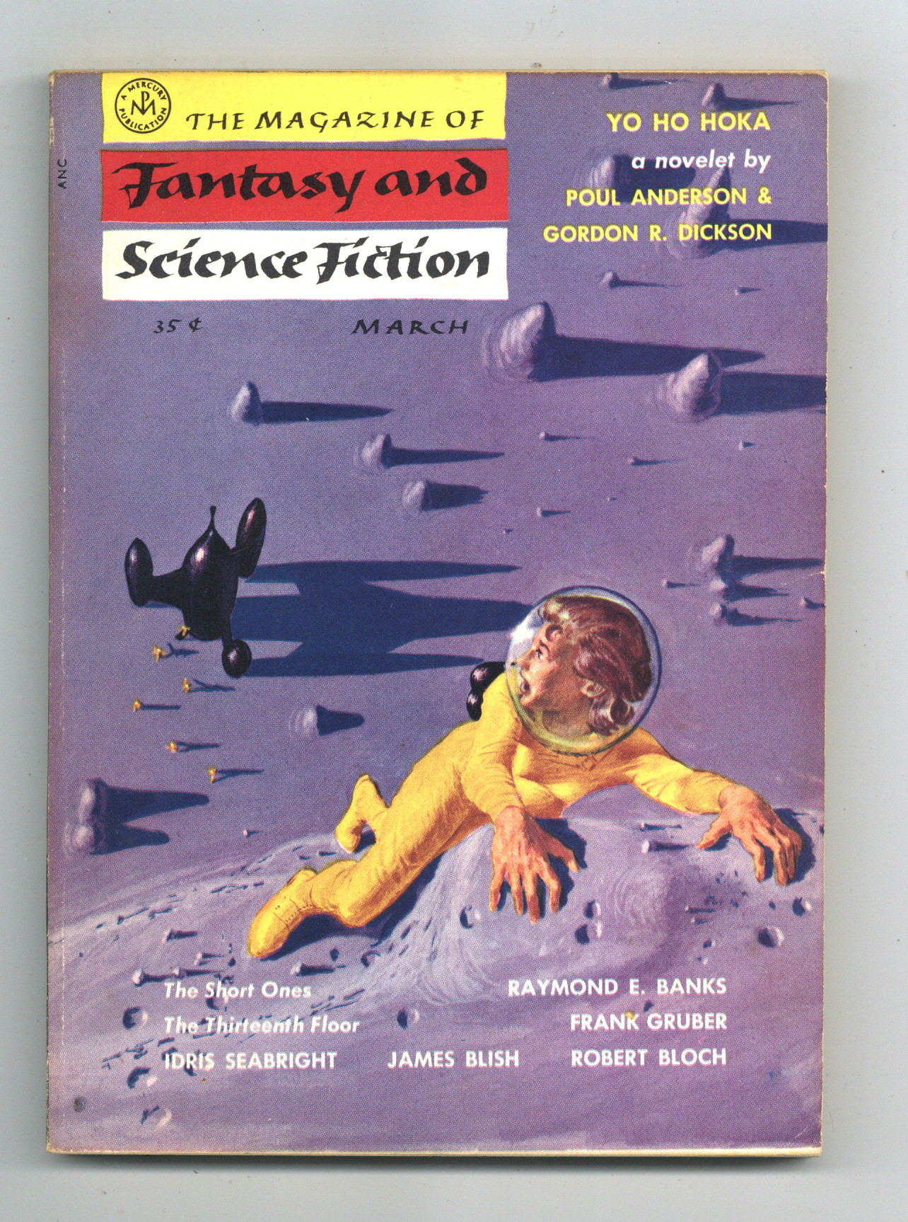Published Mar 1955 by Mercury Publications.$5.40March 1955. Whole No. 46. Cover by Nicholas Solovioff. Science fiction stories: "The Short Ones" by Raymond E. Banks, "I Do Not Love Thee, Dr. Fell" by Robert Bloch, "The Golem" by Avram Davidson, "He Had a Big Heart" by Frank Quattrocchi, "The Thirteenth Floor" by Frank Gruber, "Change the Sky" by Idris Seabright, "Overlooked" by E. C. Hornsby, "The Book of Your Life" by James Blish, "Yo Ho Hoka!" by Poul Anderson & Gordon R. Dickson, "Millennium" by Fredric Brown, and "The Bone That Seeks" by John Ciardi (as 'John Anthony'). Softcover, 5.5-in. x 7.5-in.; 128 newsprint pages, B&W. Cover price $0.35.