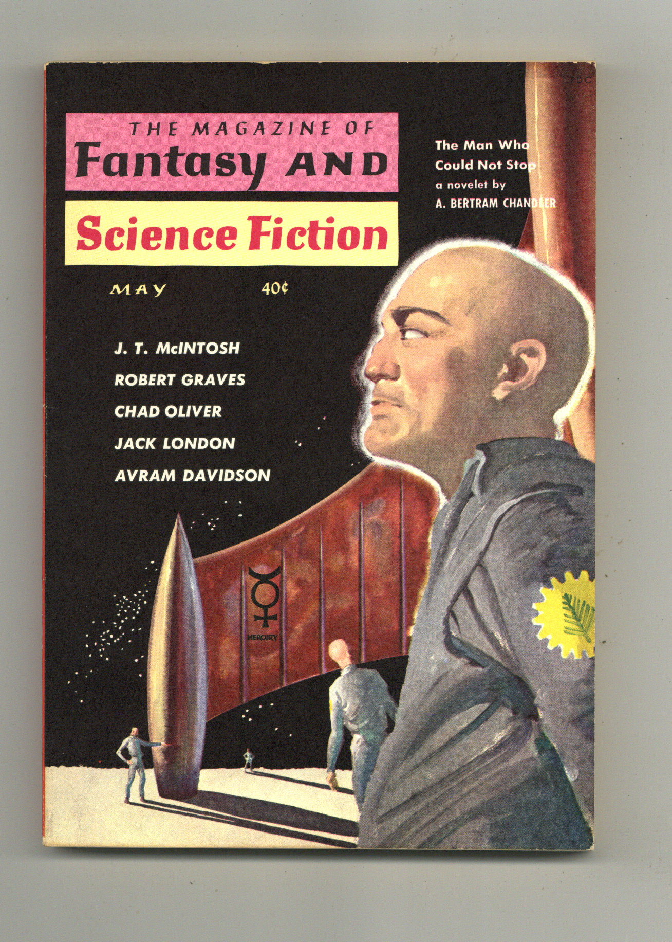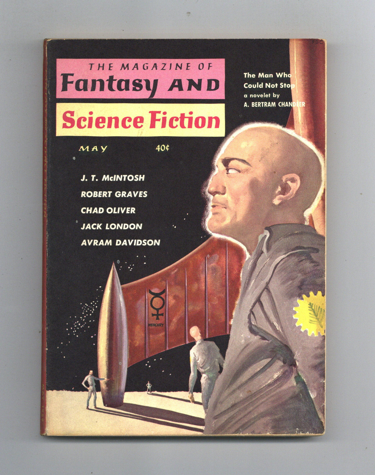Published May 1959 by Mercury Publications.$20.50May 1959. Whole No. 96. Science fiction stories: "Tenth Time Around" by J. T. McIntosh, "Science: Of Capture and Escape" by Issac Asimov, "Ralph Wollstonecraft Hedge: A Memoir" by Ron Goulart, "The One That Got Away" by Chad Oliver, "The Shout" by Robert Graves, "First Dig" by Miriam Allen deFord, "Ferdinand Feghoot: XIV" by Grendel Briarton, "Books: Wine with Your Bottle, Sir?" by Damon Knight, "Lost in Translation" by Rosel George Brown, "The Montavarde Camera" by Avram Davidson, "The Angry Mammoth" by Jack London, and "The Man Who Could Not Stop" by A. Bertram Chandler. Softcover, 5.5-in. x 7.5-in.; 128 newsprint pages, B&W. Cover price $0.40.