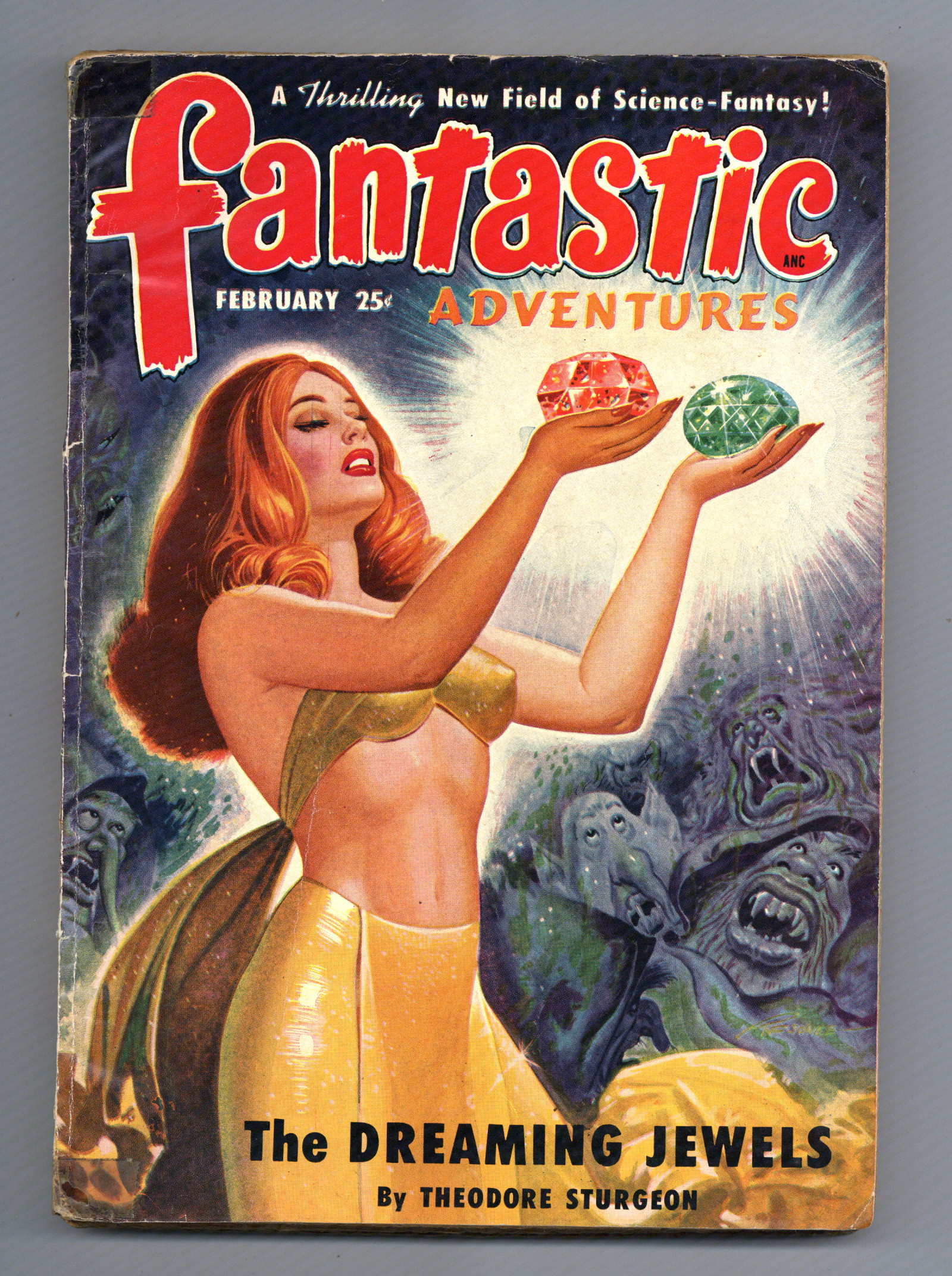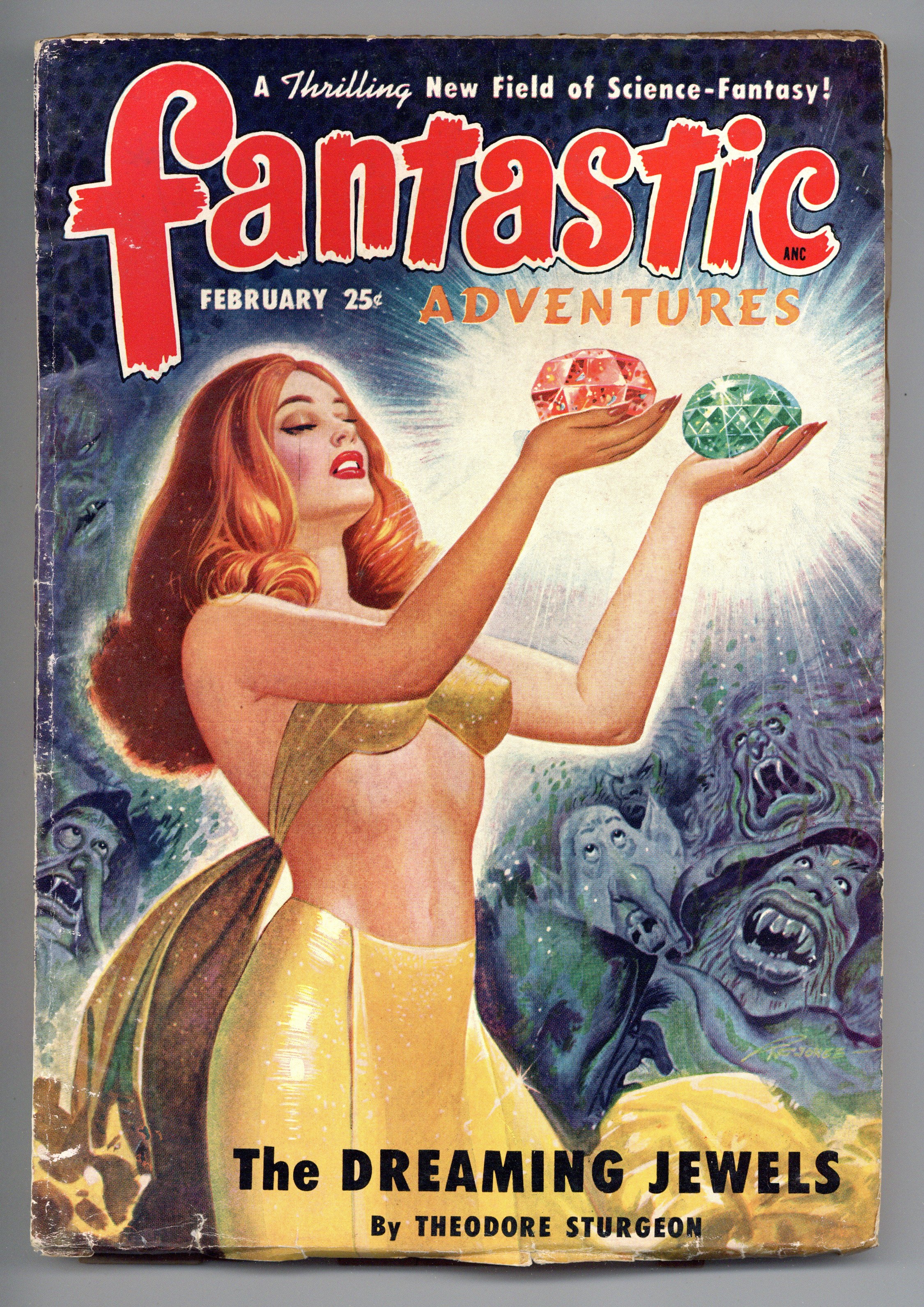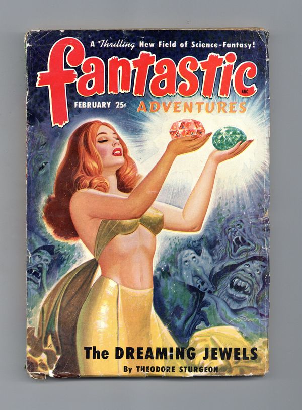Feb 1950. Cover by Robert Gibson Jones. Stories include "The Dreaming Jewels" by Theodore Sturgeon, "Doom Ship" by Robert Moore Williams, "Null F" by Peter Worth, "Mystery on Pluto" by Ward Fleming, and "The Friendly Wolf" by Craig Browning. Illustrations by Bill Terry, H. W. McCauley, and Leo Ramon Summers. 7-in. x 9.75-in.; black and white; 162 newsprint pages. Cover price $0.25.