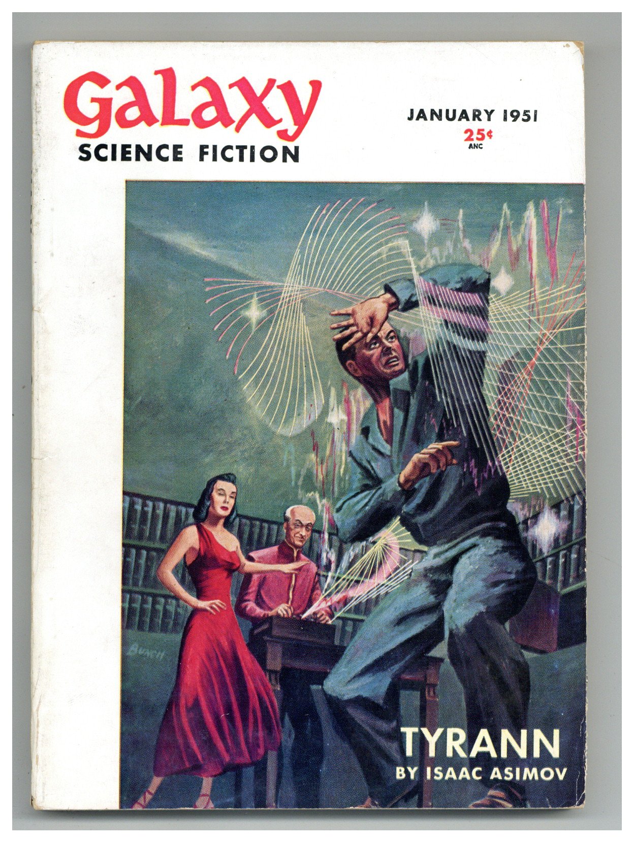Published Jan 1951 by Galaxy Publications.$7.00January 1951. Cover by John Bunch. Stories: "Tyrann"(Part 1) by Isaac Asimov, "Rule of Three" by Theodore Sturgeon, "Made to Measure" by William Campbell Gault, "The Reluctant Heroes" by Frank M. Robinson, "Dark Interlude" by Mack Reynolds and Fredric Brown, and "Susceptibility" by John D. MacDonald. 5.25-in. x 7.5-in.; 160 Pages, B&W. Cover price $0.25.