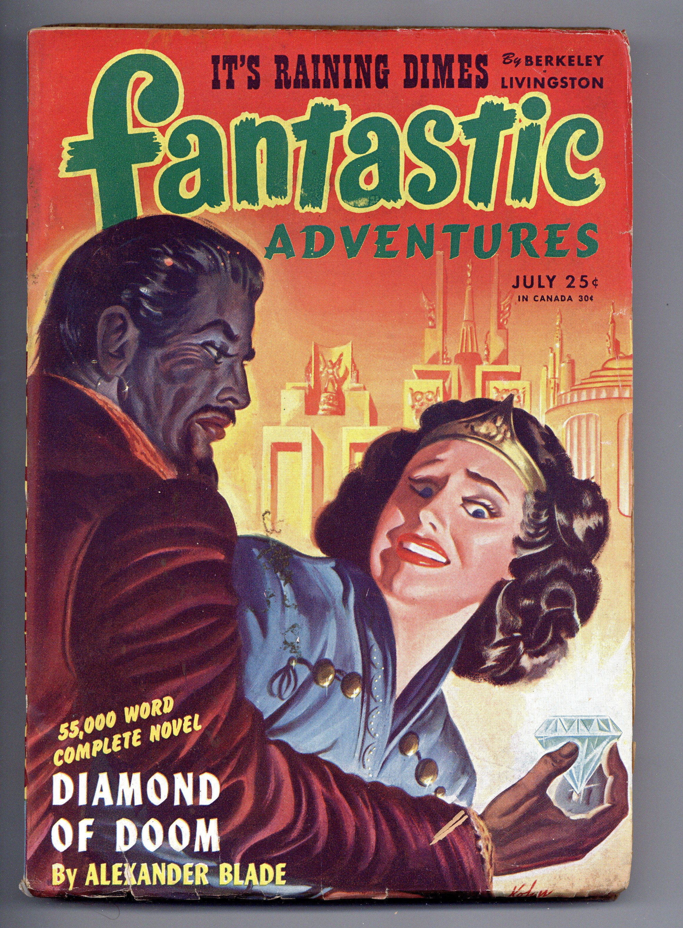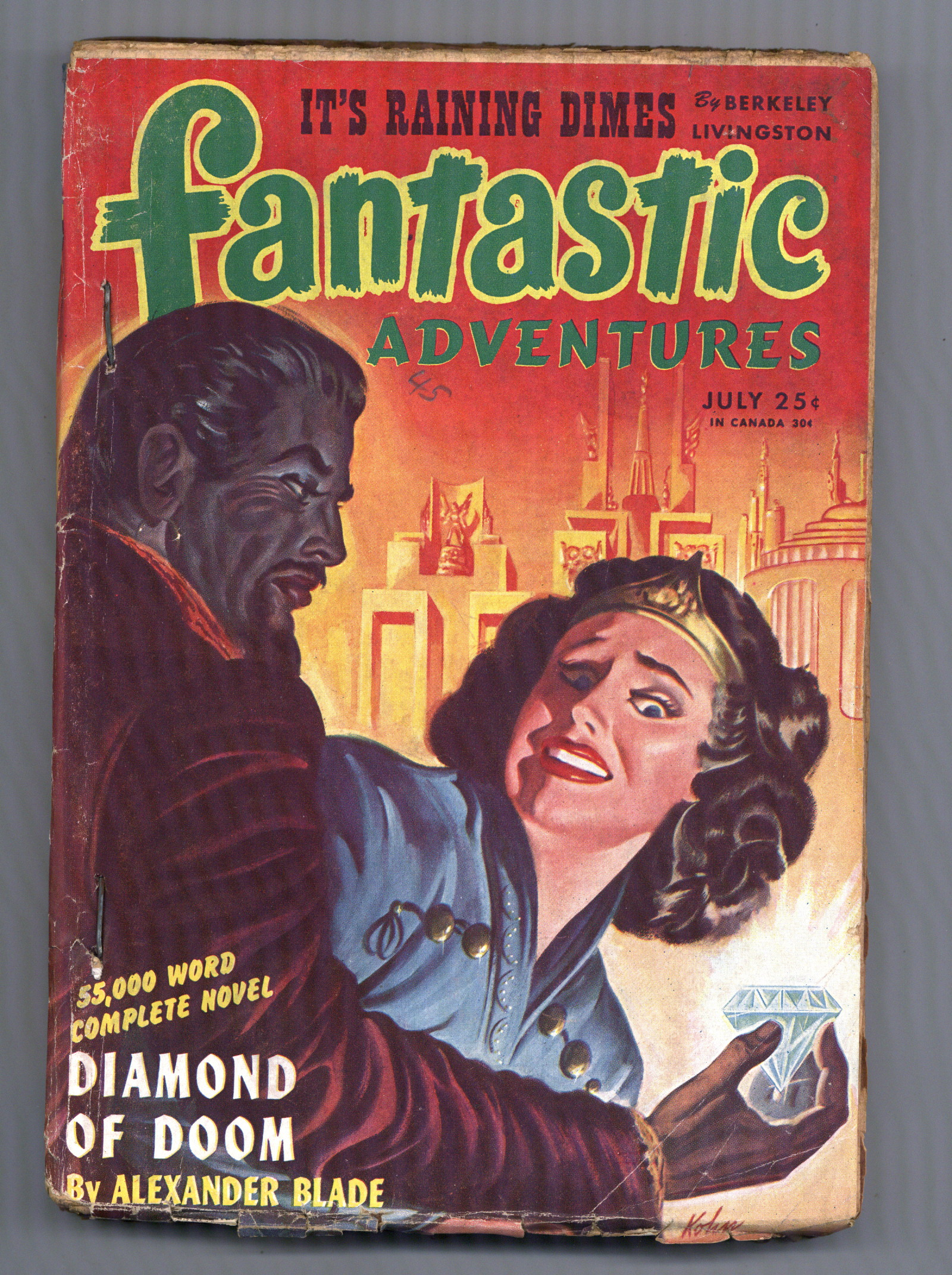 July 1945. Cover by Arnold Kohn. Stories by Alexander Blade, Berkeley Livingston (under "B. E. Liston, Lester Barclay), J. J. Allerton, E. E. Pelletier, and Berkeley Livingston (2 stories as himself). Back cover painting by Frank R. Paul. Illustrations by Hadden, Fletcher, Ronald Clyne, Arnold Kohn, Robert Fuqua, J. Allen St. John, and Margarian. Back cover by Frank R. Paul. 7-in. x 9.75-in.; black and white; 212 newsprint pages. Cover price $0.25.