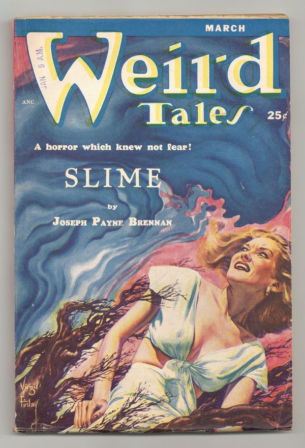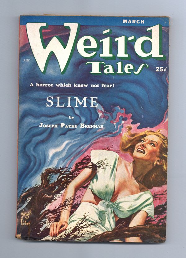 Published Mar 1953 by Weird Tales.$70.00March 1953. Cover by Virgil Finlay. Horror and supernatural fiction by Joseph Payne Brennan "Slime", Donald F. Vieweg, L. Sprague De Camp & Fletcher Pratt "Caveat Emptor", Mary Elizabeth Counselman, John Ward, Kirk Shaw, T. W. Speight, Harold Lawlor, and Appleby Terrill. Illustrations by Virgil Finlay, Jon Arfstrom, Joseph Eberle, and W. H. Silvey. 6 3/4" x 10"; black and white; 96 newsprint pages. Cover price $0.25.