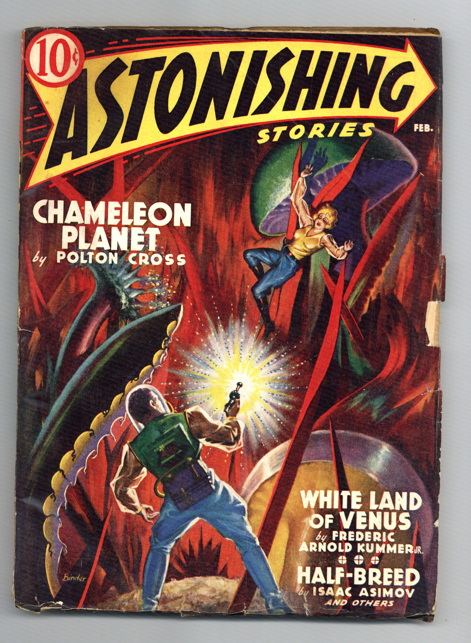 Feb 1940. 1st issue. Cover by Binder. Science fiction stories by John Russell Fearn (as 'Polton Cross'), Isaac Asimov "Half-breed", Henry Kuttner (as 'Paul Edmonds'), Frederic Arnold Kummer Jr., Manly Wade Wellman (as 'Gabriel Barclay'), Milton A. Rothman (as 'Lee Gregor'), and Martin Vaeth. Illustrations by Eron, Dan, and Lasker. 6.75-in. x 9.5-in.; black and white; 112 newsprint pages. Cover price $0.10.