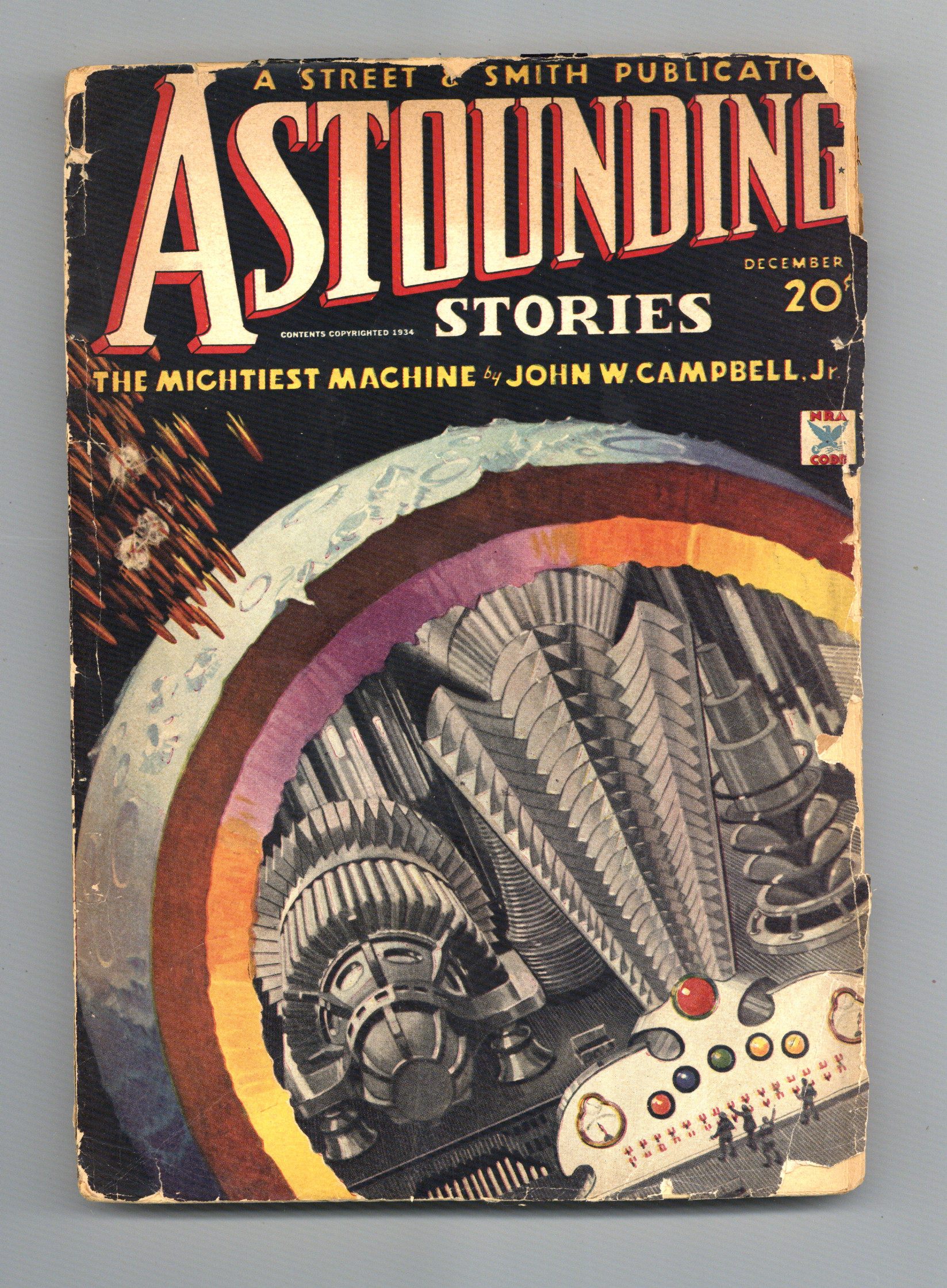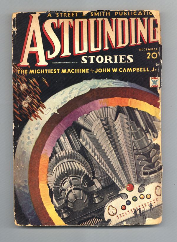 Dec 1934. Cover by Howard V. Brown. Science Fiction stories by John W. Campbell Jr ("The Mightiest Machine" part 1 of 5), Donald Wandrei, Raymond Z. Gallun, Howard W. Graham PhD, John W. Campbell Jr - as (Karl Van Campen), Don A. Stuart, Stanton A. Coblentz, and Edward E. Smith PhD "The Skylarks of Valeron-Part 5 of 7". Illustrations by Elliot Dold and M. Marchioni. 7" x 10"; black and white; 144 newsprint pages. Cover price $0.20.