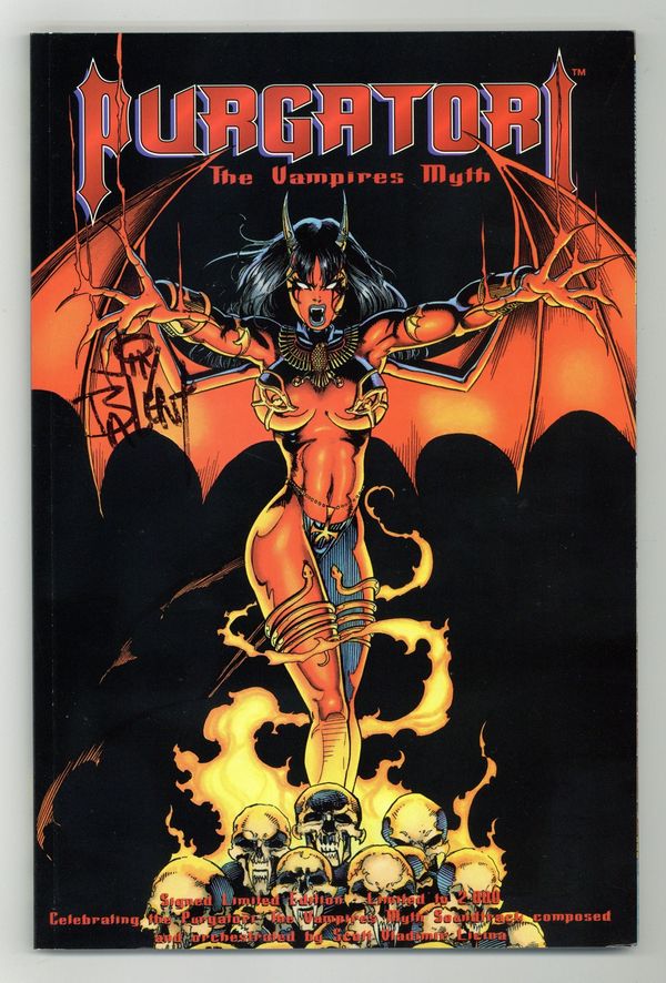 $24.00Signed by Jim Balent - 1st printing. Collects Purgatori: The Vampire's Myth (1996) #1-3. Written by Brian Pulido. Art by Jim Balent. She is PURGATORI, the demonic queen of vampires, consort to the ruler of Hell, and arch-enemy of LADY DEATH. Cast out of Hell, she now prowls the Earth to regain her lost power - but her two offspring, KABALA and JADE, have a plan to stalk her, capture her, and force her to answer an age-old question...which can only be answered by revealing PURGATORI'S own history! From ancient Egypt to modern Alexandria, join us as the dark origin of PURGATORI unfolds. Includes a cover gallery by Brian Pulido and Jim Balent. Also featuring the Purgatori: The Vampire's Myth Soundtrack CD composed and orchestrated by Scott Vladimir Licina. Softcover, 88 pages, full color. NOTE: Limited to 2,000 copies. May or may NOT include certificate of authenticity. Cover price $30.00.