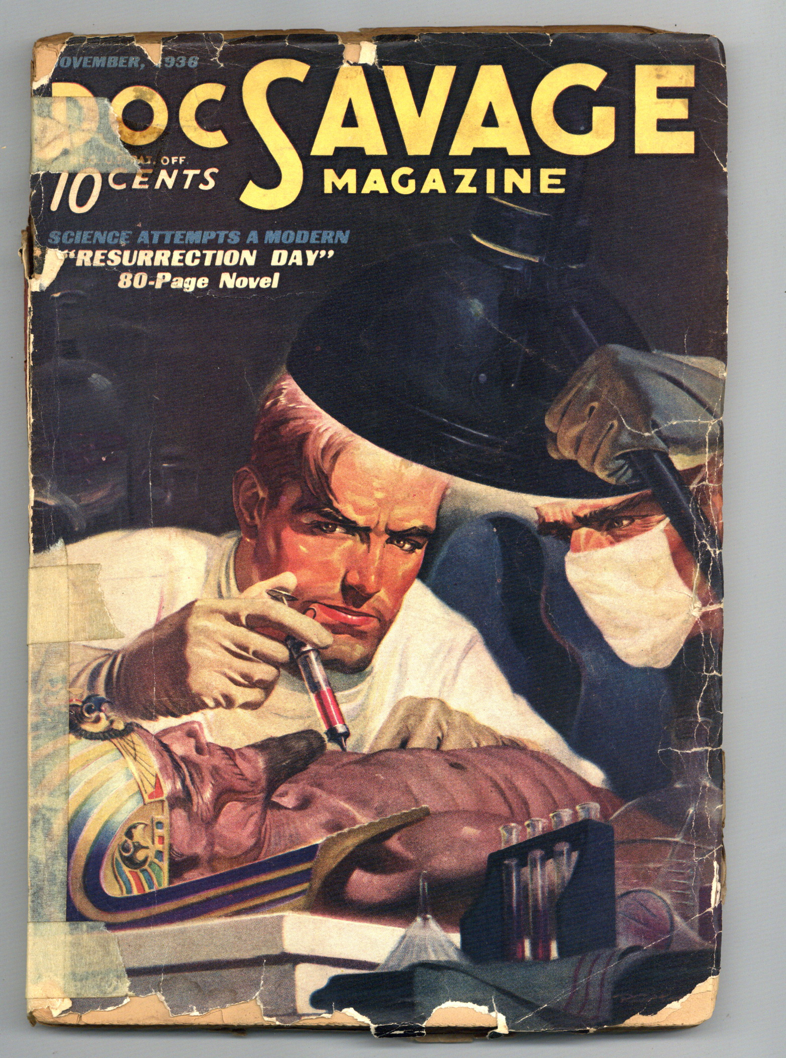 Nov 1936. Cover by Robert G. Harris. Doc Savage stars in "Resurrection Day" written by Kenneth Robeson, other action stories by Donald S. Matthew, Steve Fisher, and Harold F. Cruickshank. 7" x 10"; black and white; 128 newsprint pages.