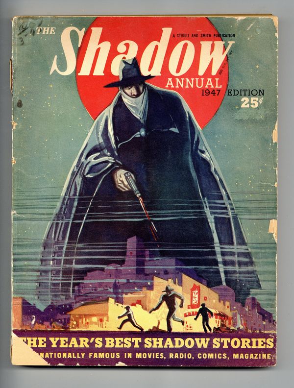 1947 Edition (bedsheet format). Cover by Modest Stein. Three Shadow stories by Maxwell Grant - "No Time for Murder", "Toll of Death", and "Murder by Magic". Other action stories by Richard Dermody and Franklin Gregory. 8 1/2" x 11"; black and white; 144 newsprint pages. Cover price $0.25.