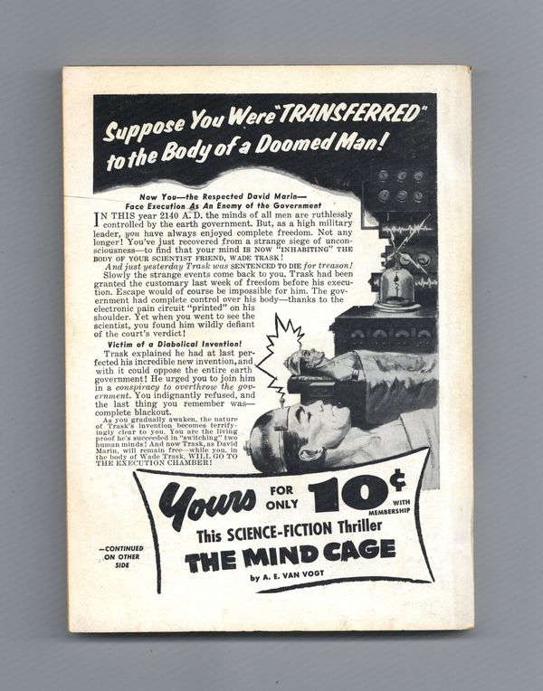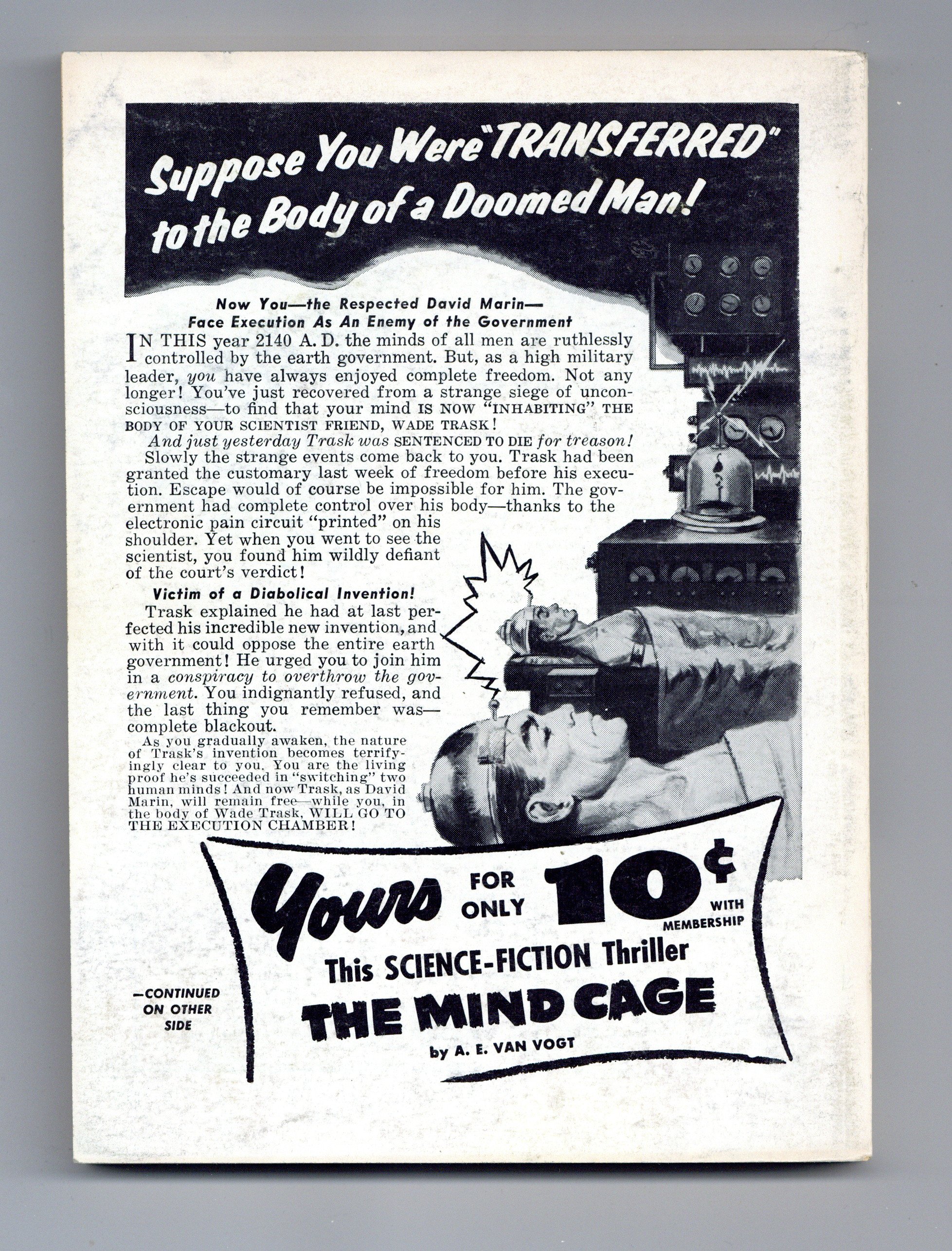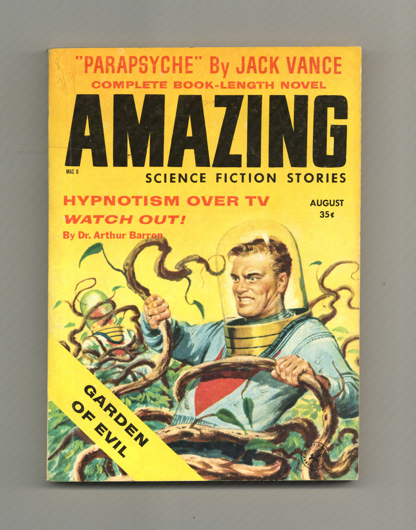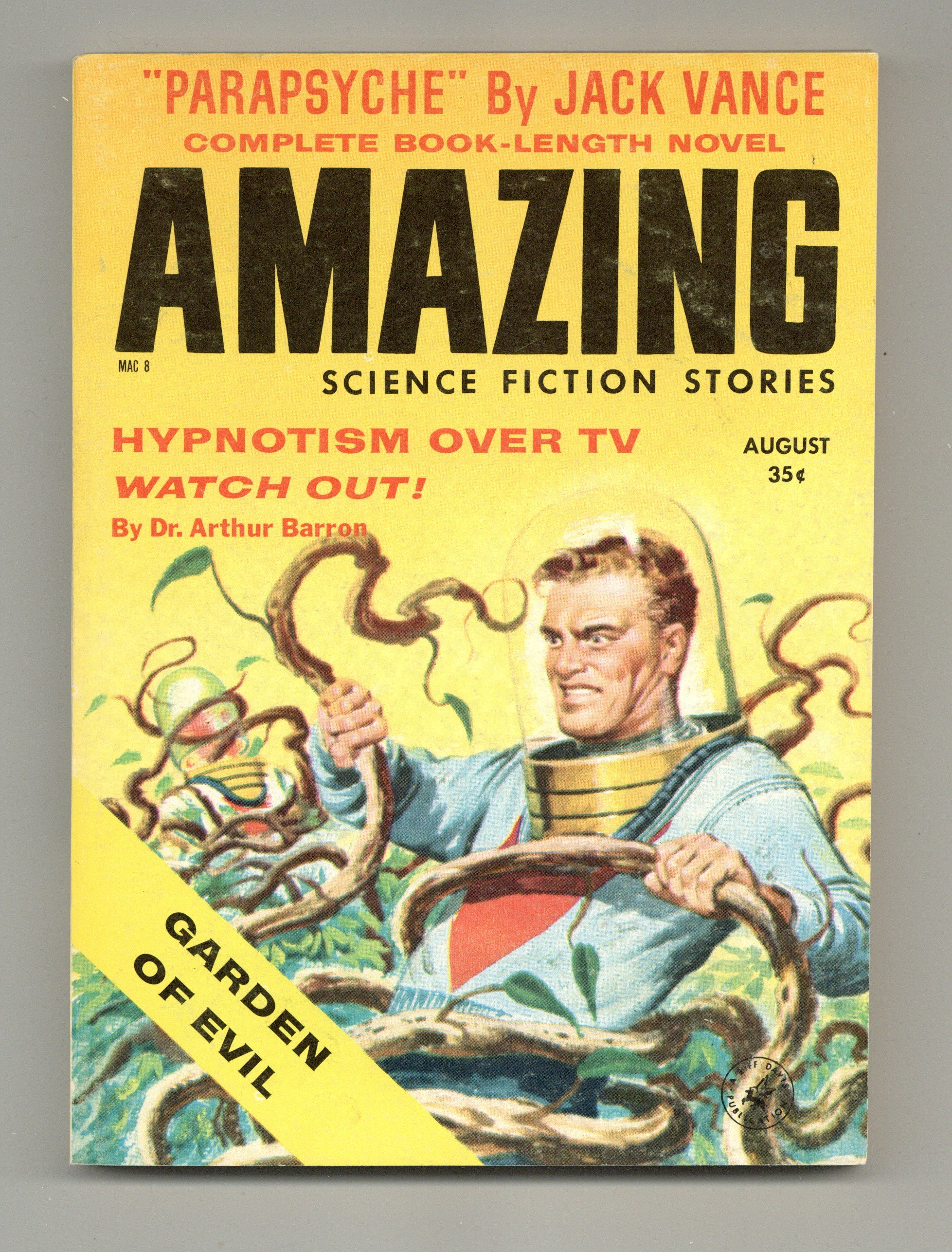 Published Aug 1958 by Experimenter Publications.$33.00August 1958. Volume 32, Issue 8. Cover by Edward Valigursky. "Parapsyche" by Jack Vance. Other science fiction stories by Henry Slesar, Frank Bryning, Bertram Chandler, Al Sevcik, & Michael M. Cahill. Interior illustrations by Virgil Finlay, Ernest Schroeder, Frosty, Llellewyn, & Kweskin. Softcover digest, 5.5-in. x 7.75-in., black and white, 146 pages. Cover price $0.35.