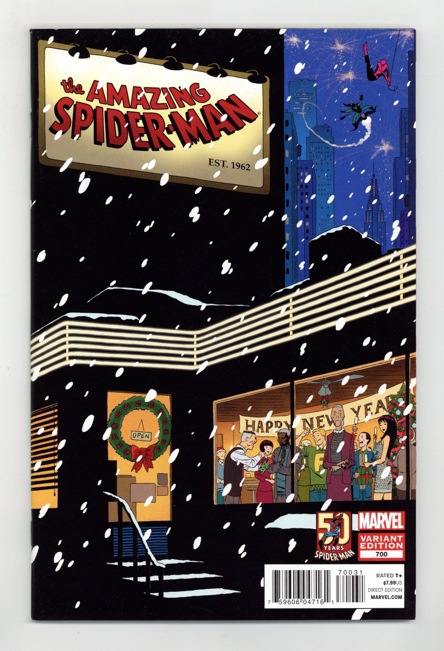 Variant Cover by Marcos Martin. Dying Wish: Part 2 of 2. Written by Dan Slott, J.M. DeMatteis and Jen Van Meter. Art by Humberto Ramos, Giuseppe Camuncoli, Stephanie Buscema, Victor Olazaba and Sal Buscema. Marvel Comics proudly presents the end of a 700 issue era! Featuring "Dying Wish: Suicide Run" by Dan Slott, Humberto Ramos and Victor Olazaba. Plus these extra amazing, spectacular and sensational stories: "Spider-Dreams" by J.M. DeMatteis, Giuseppe Camuncoli and Sal Buscema, and "Date Night: A Black Cat Storybook Adventure!" by Jen Van Meter and Stephanie Buscema. Also: cover gallery featuring all 700 Amazing Spider-Man covers; special previews of the all-new Spidey books; and the final Amazing Spider-Mail featuring Stan "The Man" Lee answering your questions! 104 pages, full color. Rated T+ Cover price $7.99.