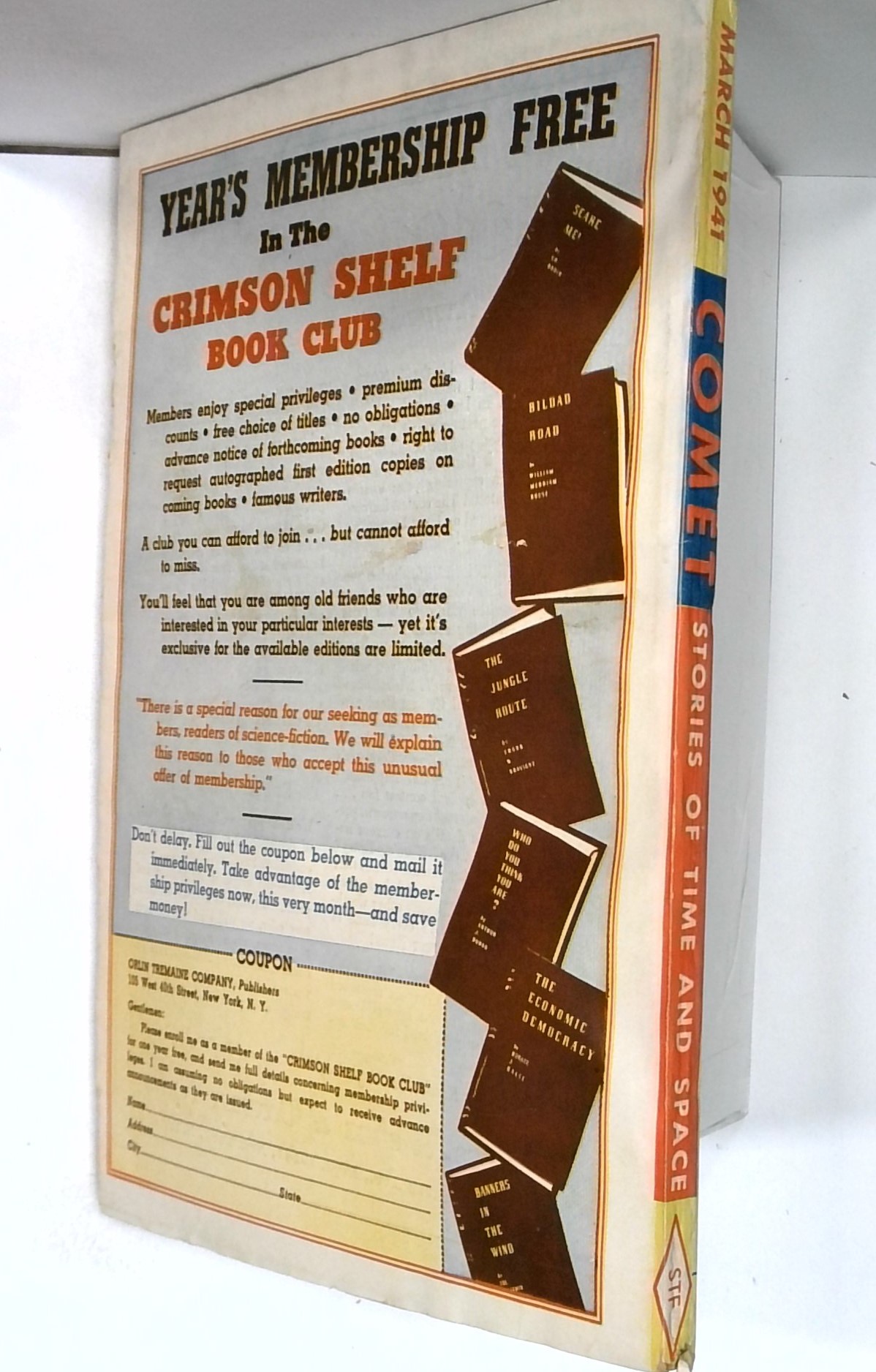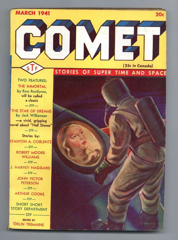 July 1941. Cover by Leo Morey. Science Fiction stories by Ross Rocklynne, Jack Williamson, C. M. Kornbluth (as 'Arthur Cooke'), Stanton A. Koblentz, J. Harvey Haggard, Robert Moore Williams, John Victor Peterson, Thomas S. Gardiner, and Donald A. Wolheim (as 'Millard V. Gordon'). Illustrations by Forte, Kyle, Glantz, Giunta, Mirando, and Taurassi. 7" x 10"; black and white; 128 newsprint pages. Cover price $0.20.