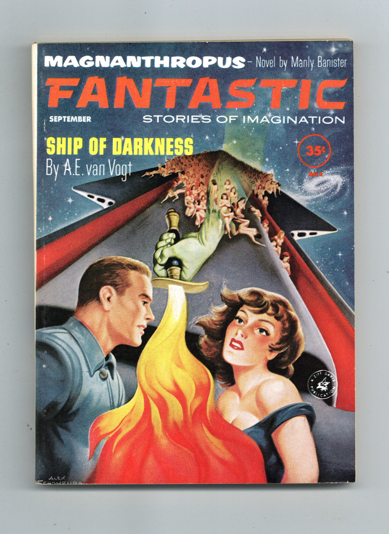 Published Sep 1961 by Ziff Davis.$16.00September 1961. Cover by Alex Schomburg. Science fiction and fantasy stories by A. E. Van Gogt (classic fantasy reprint, "Ship of Darkness"), A. Bertram Chandler, Daniel F. Galouye, C. C. MacApp, and Manly Banister ("Magnanthropus" part 1/2). Illustrations by Dan Adkins, Virgil Finlay, Richard Bassford, Leo Summers, and George L. Schelling. 5.5-in. x 7.75-in.; black and white; 130 newsprint pages. Cover price $0.35.