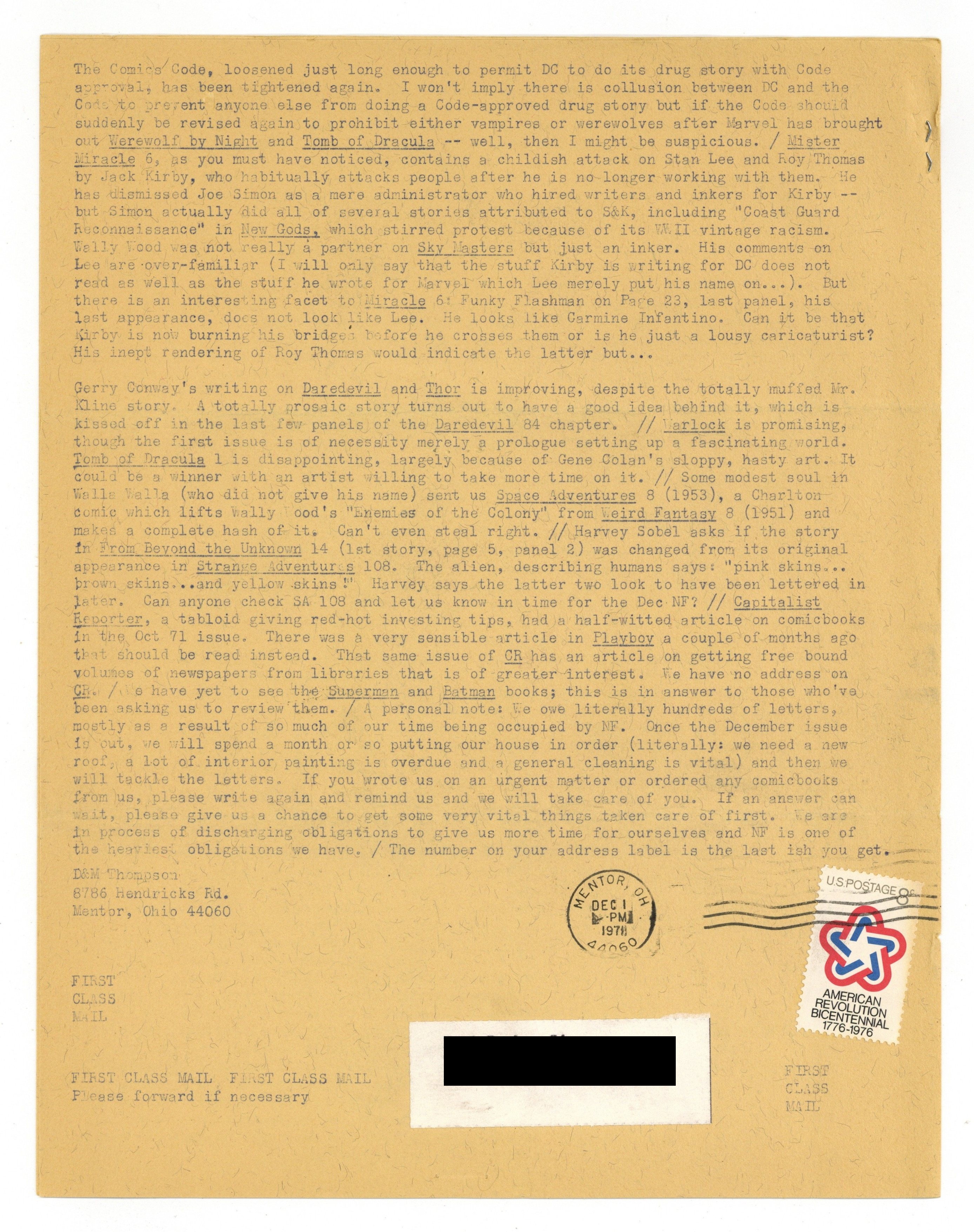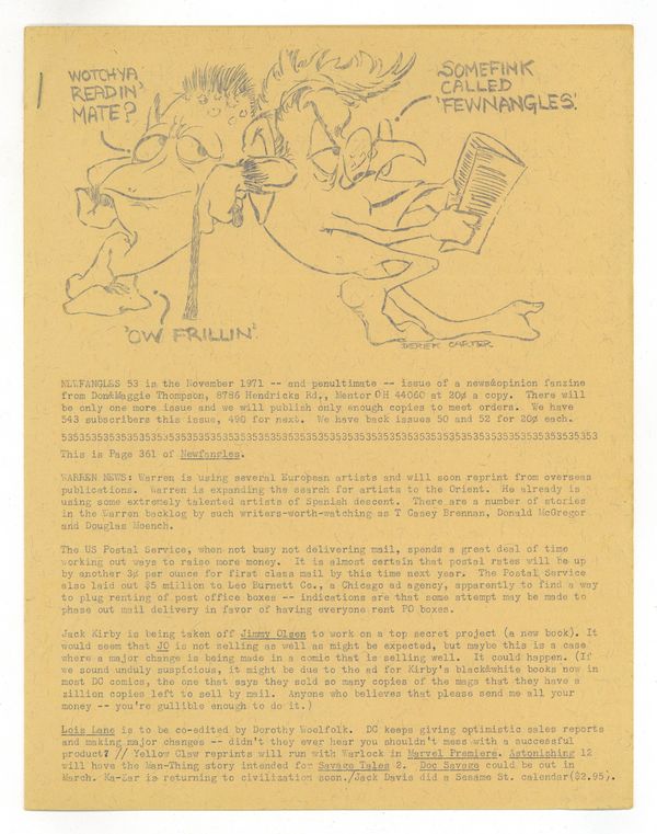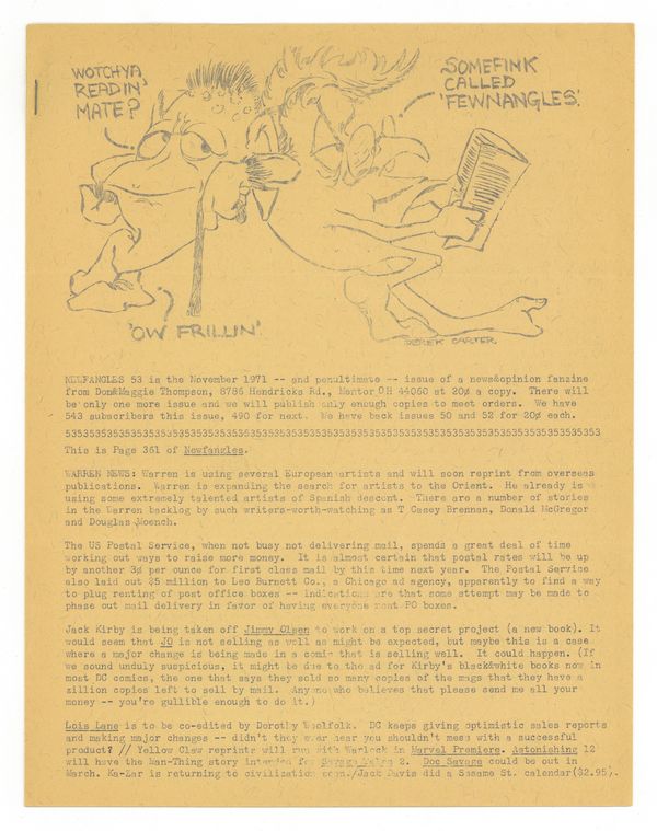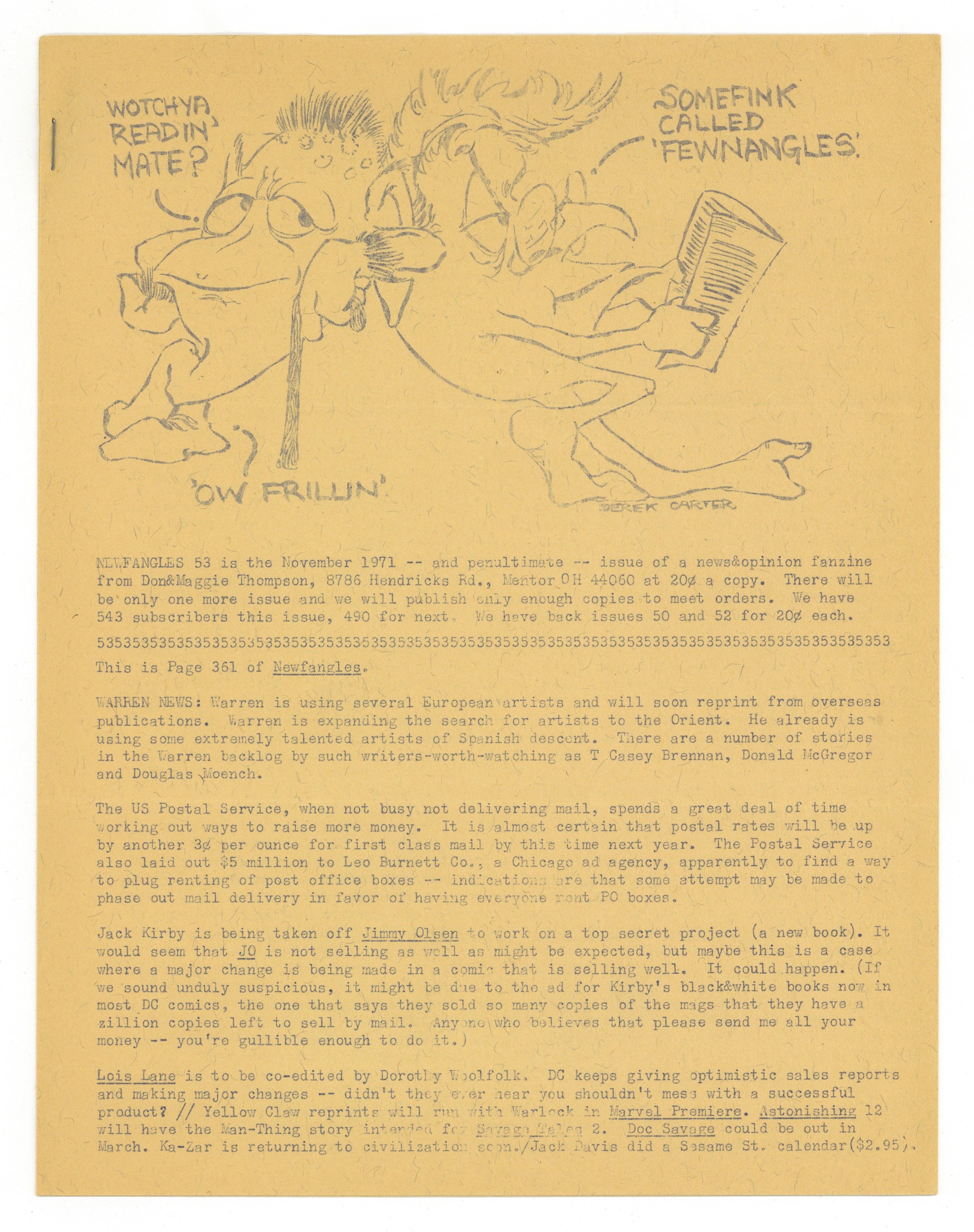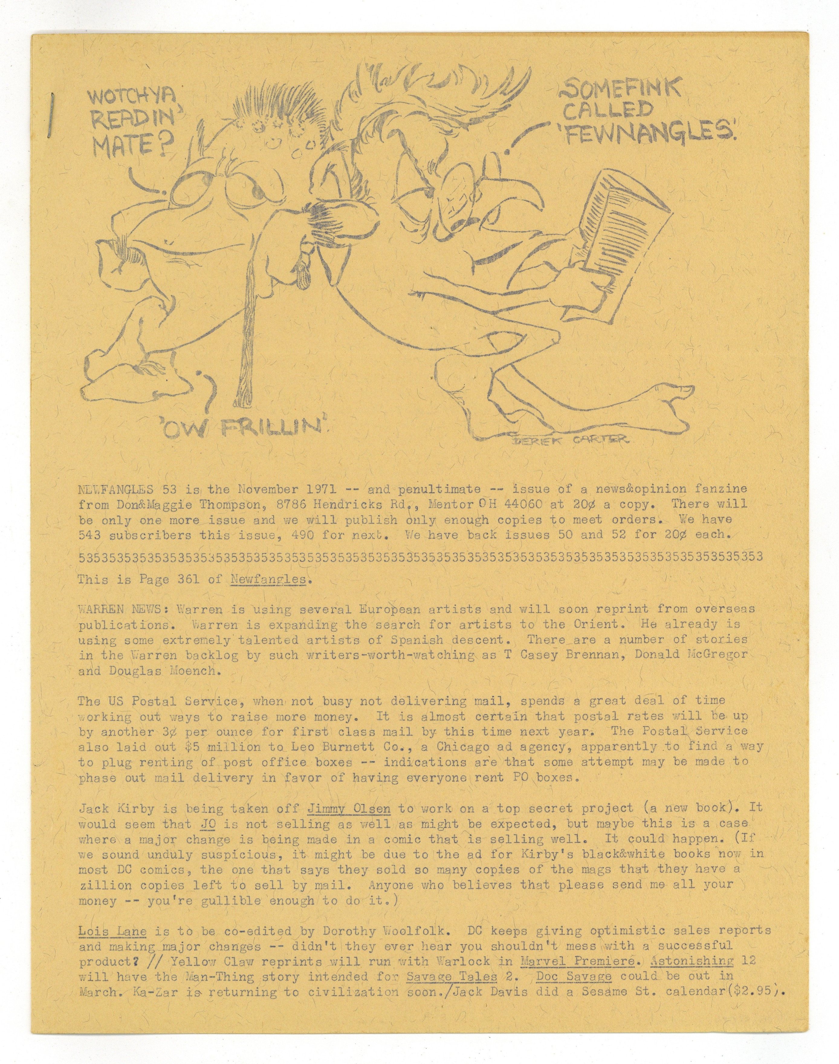 Published Nov 1971 by Don and Maggie Thompson.$45.00Published by Don and Maggie Thompson, Newfangles is a fanzine featuring comic book news and classified ads. Issue #53 includes: news on Jack Kirby being taken off Jimmy Olsen for a new project, comics code; reviews of several comics including Mother Oats #2 (underground comic); want list comics for Don Thompson; and more. 6 pages. November, 1971. Circulation: 543. Cover price $0.20.