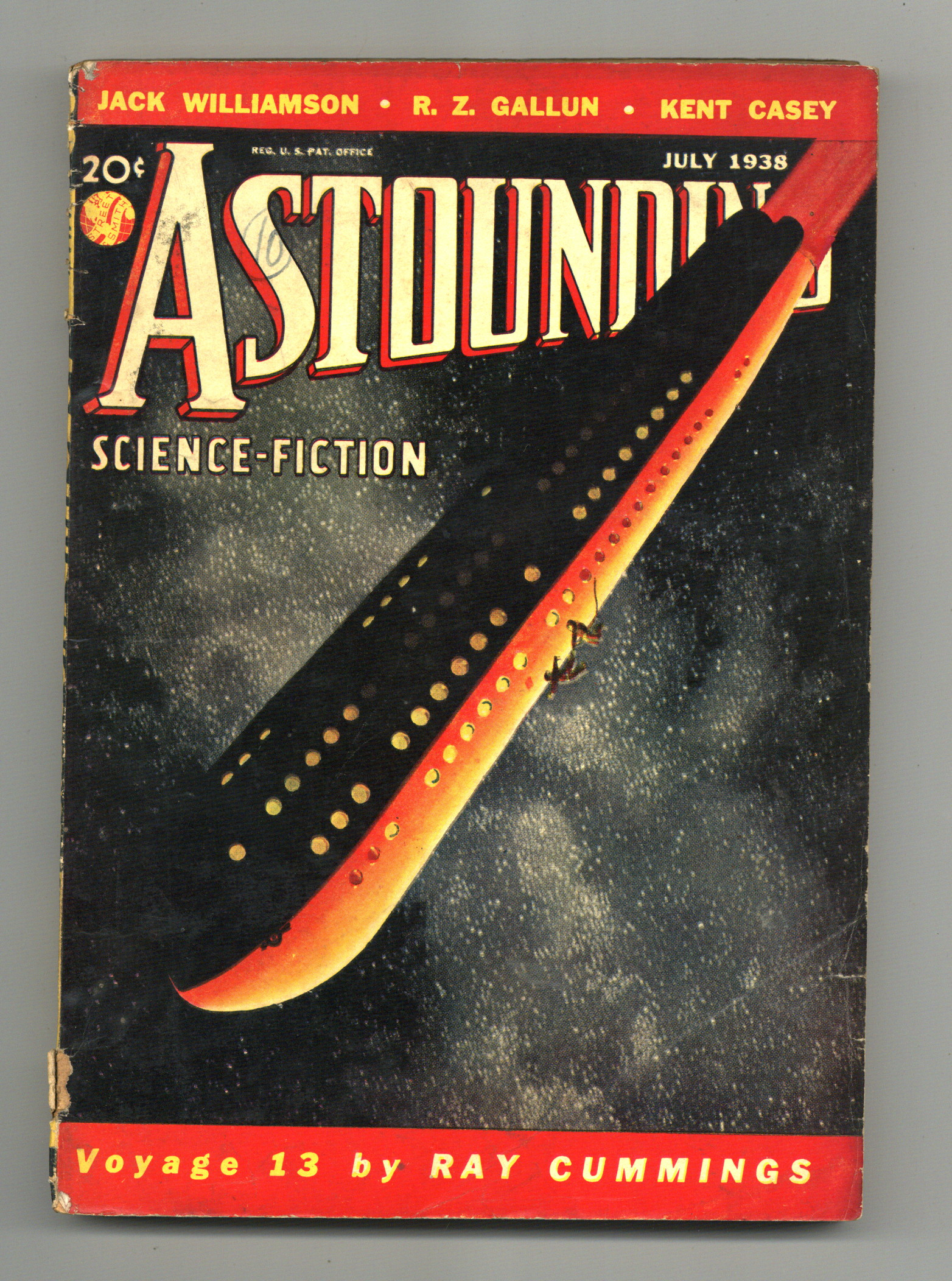 July 1938. Volume 21, Issue 5. Cover by Howard V. Brown. Science fiction stories by L. Ron Hubbard ("The Dangerous Dimension" - 1st published 'Science Fiction' story by Hubbard), Clifford D. Simak, Ross Rocklynne, Ray Cummings, Clifton B. Kruse, Kent Casey, and Raymond Z. Gallun. Illustrations by Howard V. Brown, Elliot Dold Jr, Charles Schneeman, C. R. Thomson, and H. Wesso. Trimmed pulp, 6.5-in. x 9.5-in.; black and white; 160 newsprint pages. Cover price $0.20.