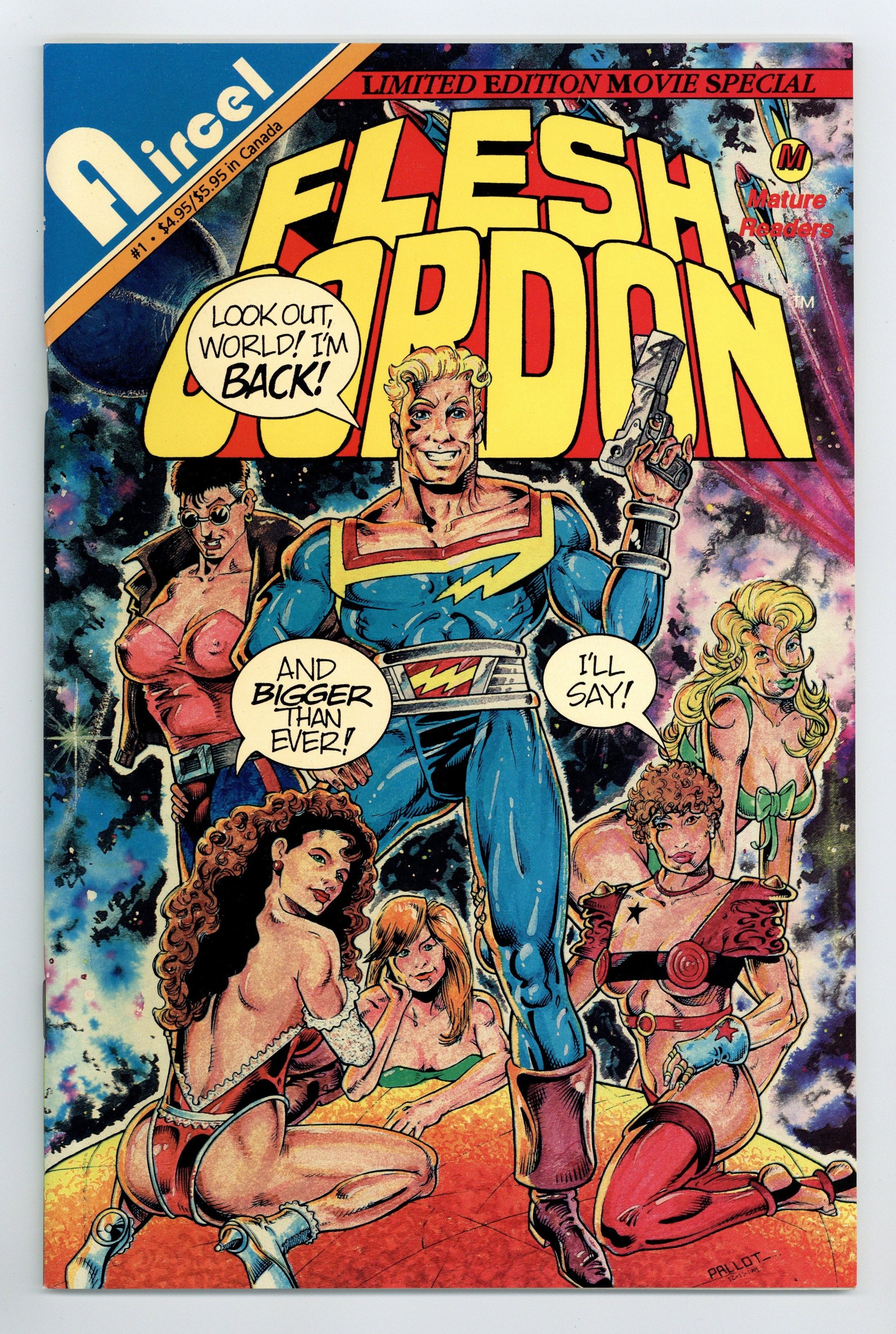 $18.75Limited Edition. Individually numbered on back cover. Cover by Glenn Lumsden and Tom Smith. Part One, script by Daniel Wilson, pencils by Marvin Perry Mann, inks by Terry Pallot; Flesh is kidnapped by time traveler P'ntang on the eve of his wedding to Dale Ardor. Sample storybook layouts for the 1992 movie; Flesh returns to the Planet Porno. Based on the R-rated movie parody of the Flash Gordon strip. Adults only. 36 pgs., B&W. $4.95. Cover price $4.95.