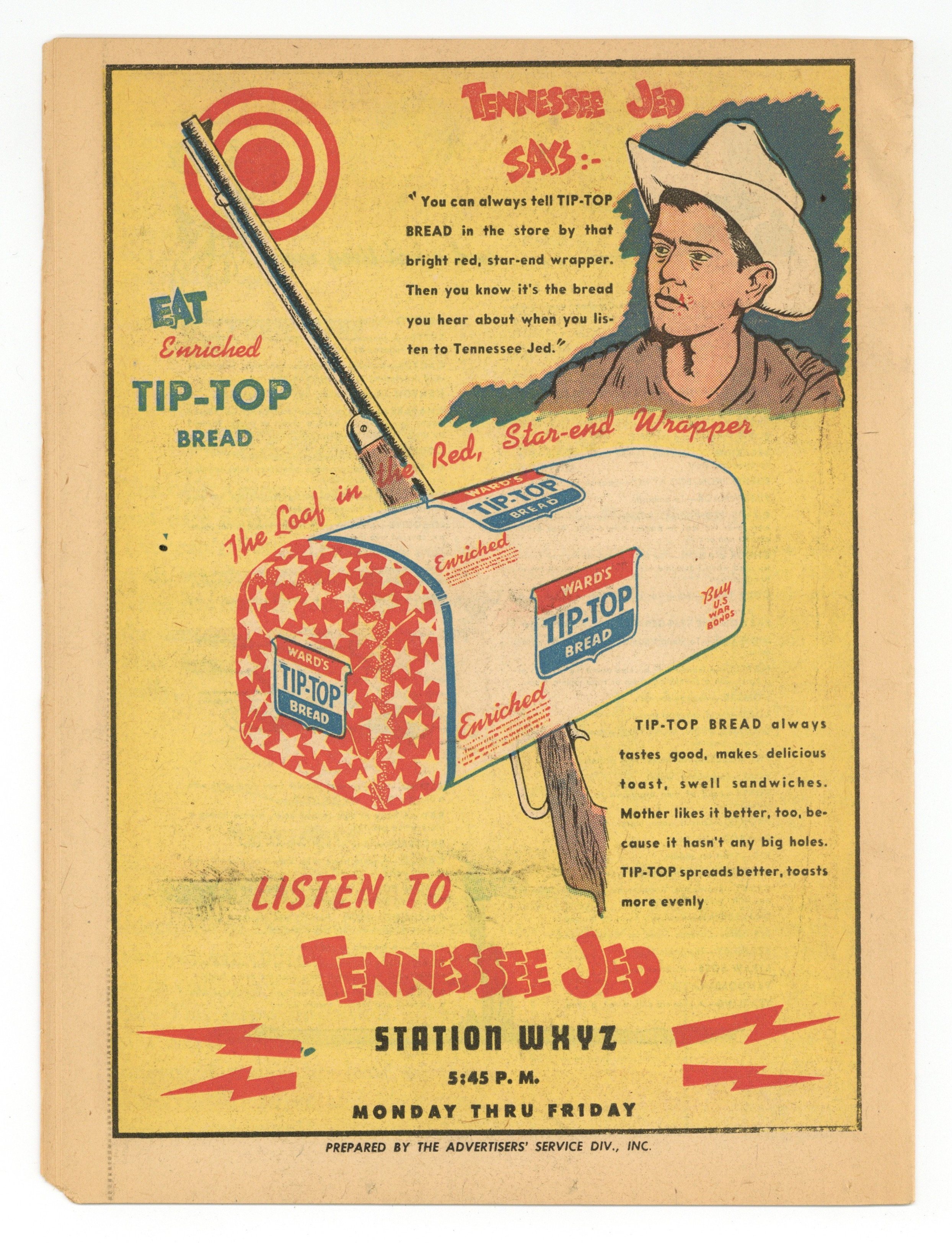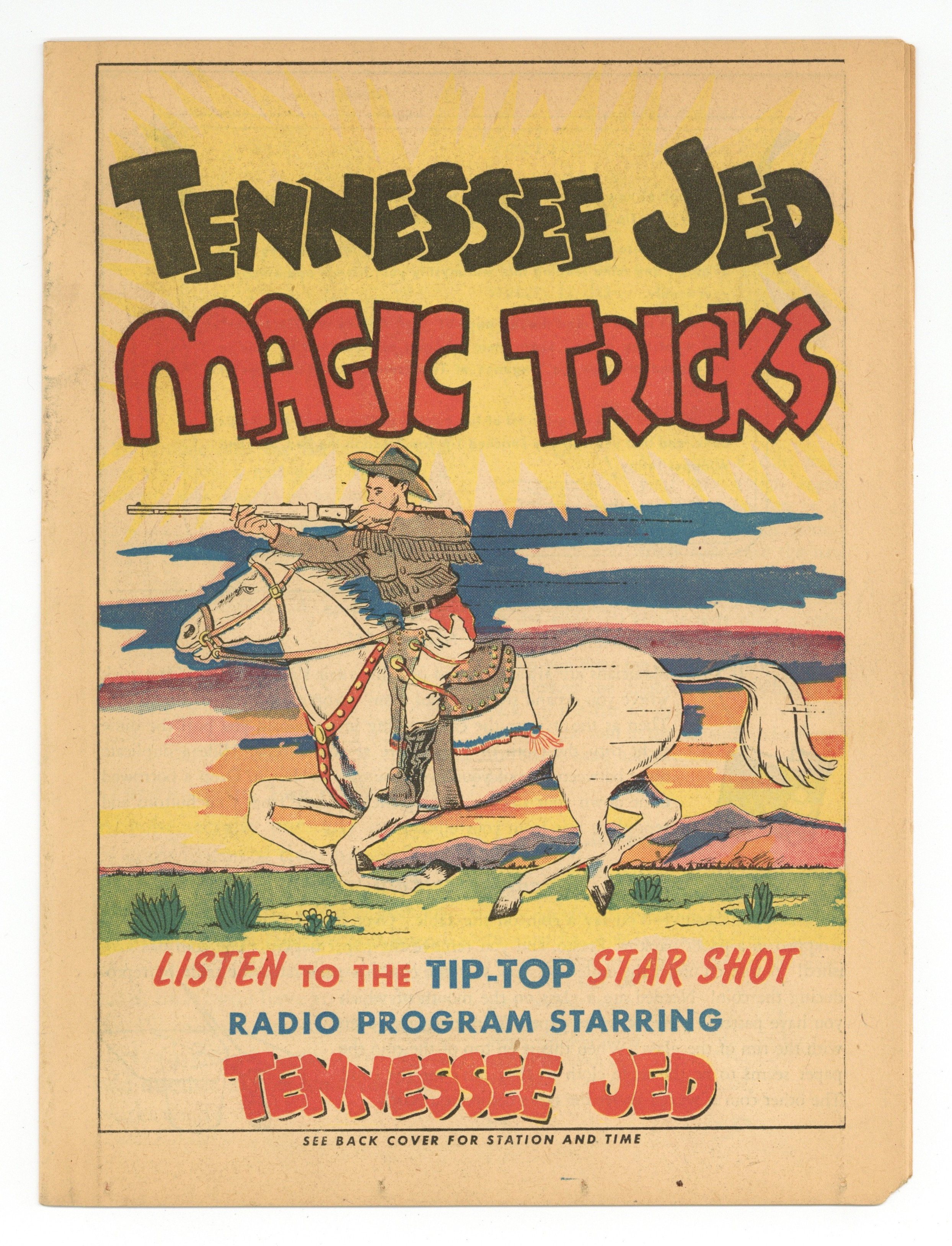 Published 1945 (est.) by William C. Popper.$85.00Not Numbered and Not Dated. This is a promotional giveaway featuring the radio-serial character, Tennessee Jed. There is No comic story. Inside, the comic teaches dozens of different magic tricks (coin tricks, paper tricks, water tricks, etc.) with explanations and illustrations for each one. The inside back cover gives a list of western terms and their meanings....Did you know that 'shakedown' is a cowboy's name for his bed? Paper-cover; 7 1/2-in. x 10-1/8-in.; color; 16 newsprint pages.