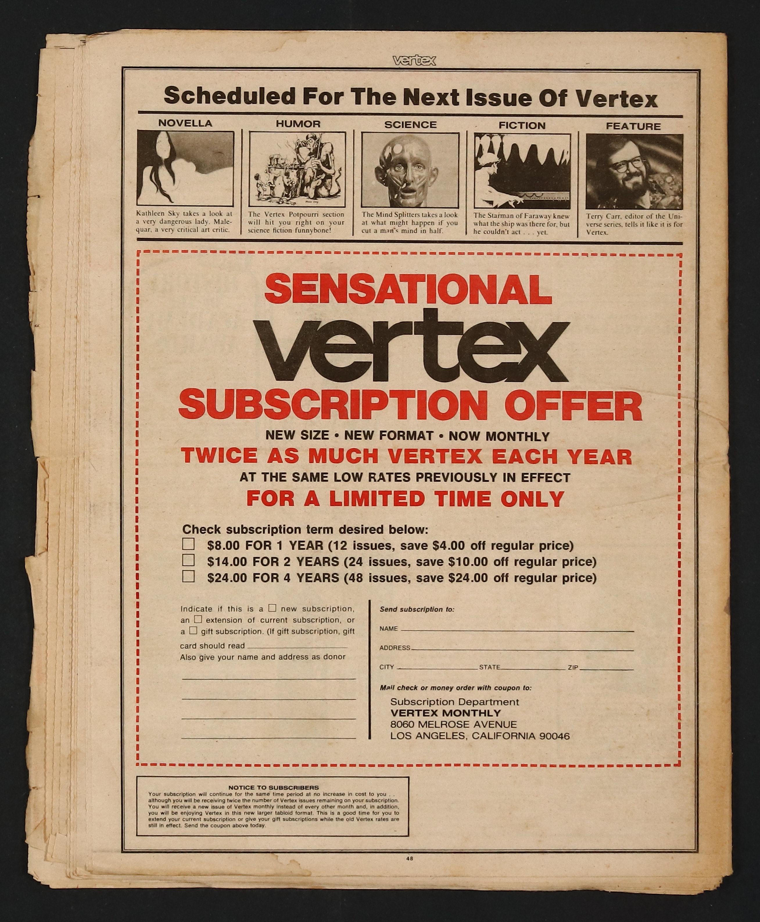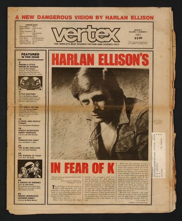 Published Jun 1975 by Mankind Publishing Compan.$18.00"The Magazine of Science Fiction." June 1975. 1st Tabloid Format Issue. SF stories by Harlan Ellison ("In Fear of K"), Fletcher Stewart, John Varley, Neil Shapiro, Samuel Henderson, Albert C. Ellis, Scott Edelstein, & F. M. Busby. Interviews with Harry Harrison, Leonard Nimoy (Meet Mr. Spock). Illustrations by Felix Marich, Rodger MacGowan, Gregg Davidson, Monte Rogers, George Barr, Alicia Austin, & William Rotsler. Tabloid Format, b&w, 48 newsprint pages. Cover price $1.00.