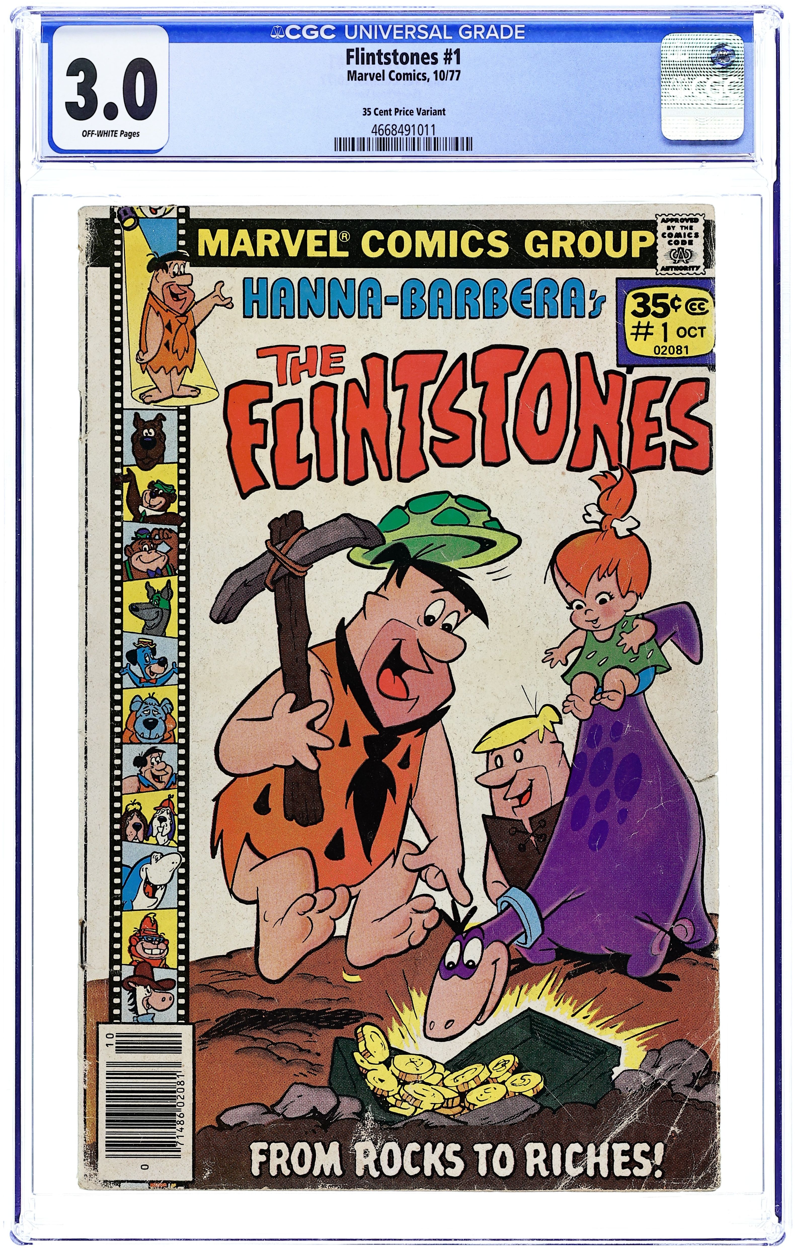 35 Cent Price Variant, limited distribution. Hanna-Barbera's Flintstones: "From Rocks to Riches!"; Fred Flintstone, Barney Rubble, Pebbles, Bamm-Bamm, Dino. Cover price $0.35.