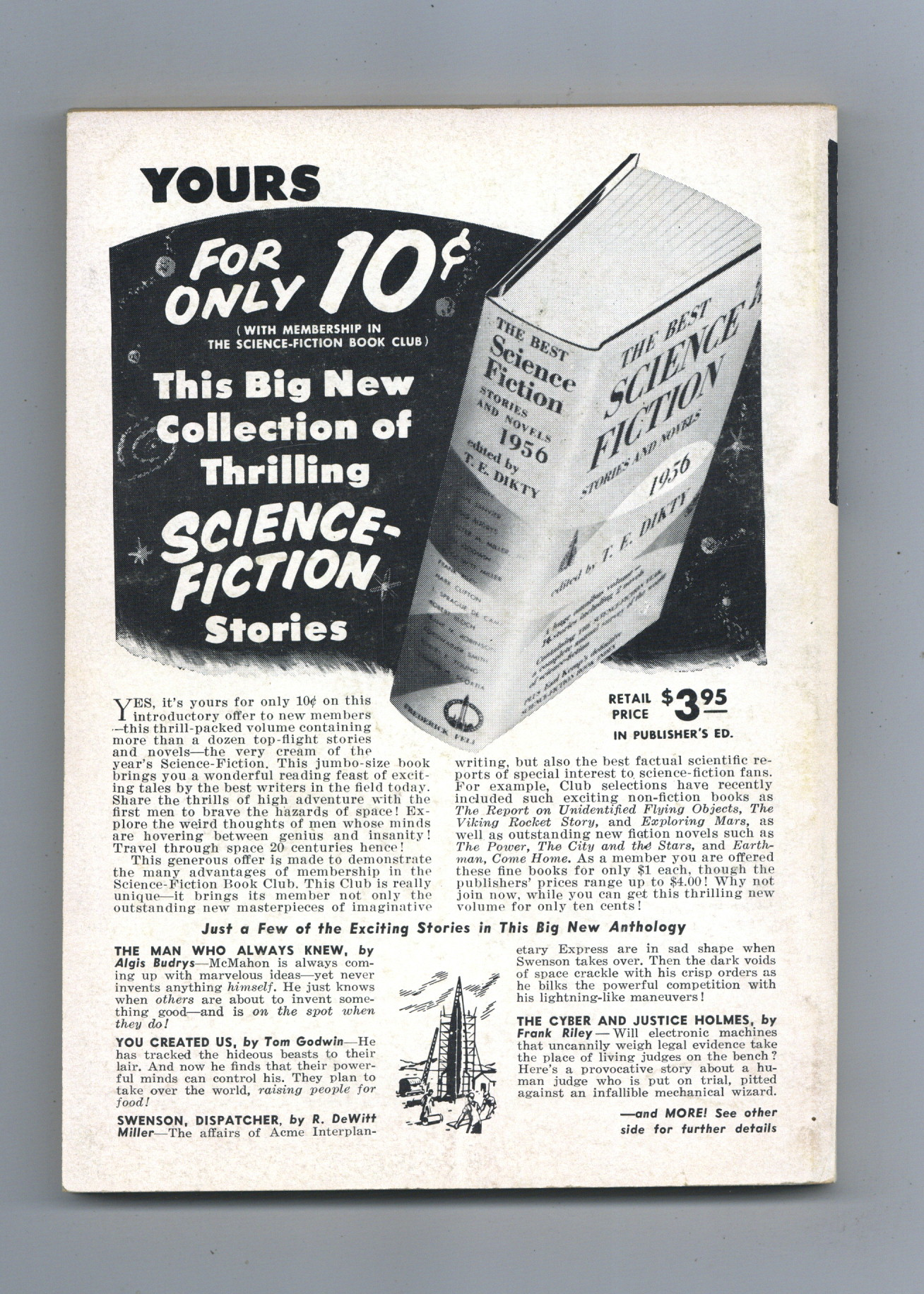 Published May 1957 by Ziff Davis.$16.00May 1957. Science fiction and fantasy stories by Henry Slater, Robert Silverberg, Ralph Burke, Stanley Mullen, Calvin Knox, and Hall Thornton. Virgil Finlay illustration. Cover by Edward Valigursky. 5.5-in. x 7.75-in.; black and white; 128 newsprint pages. Cover price $0.35.