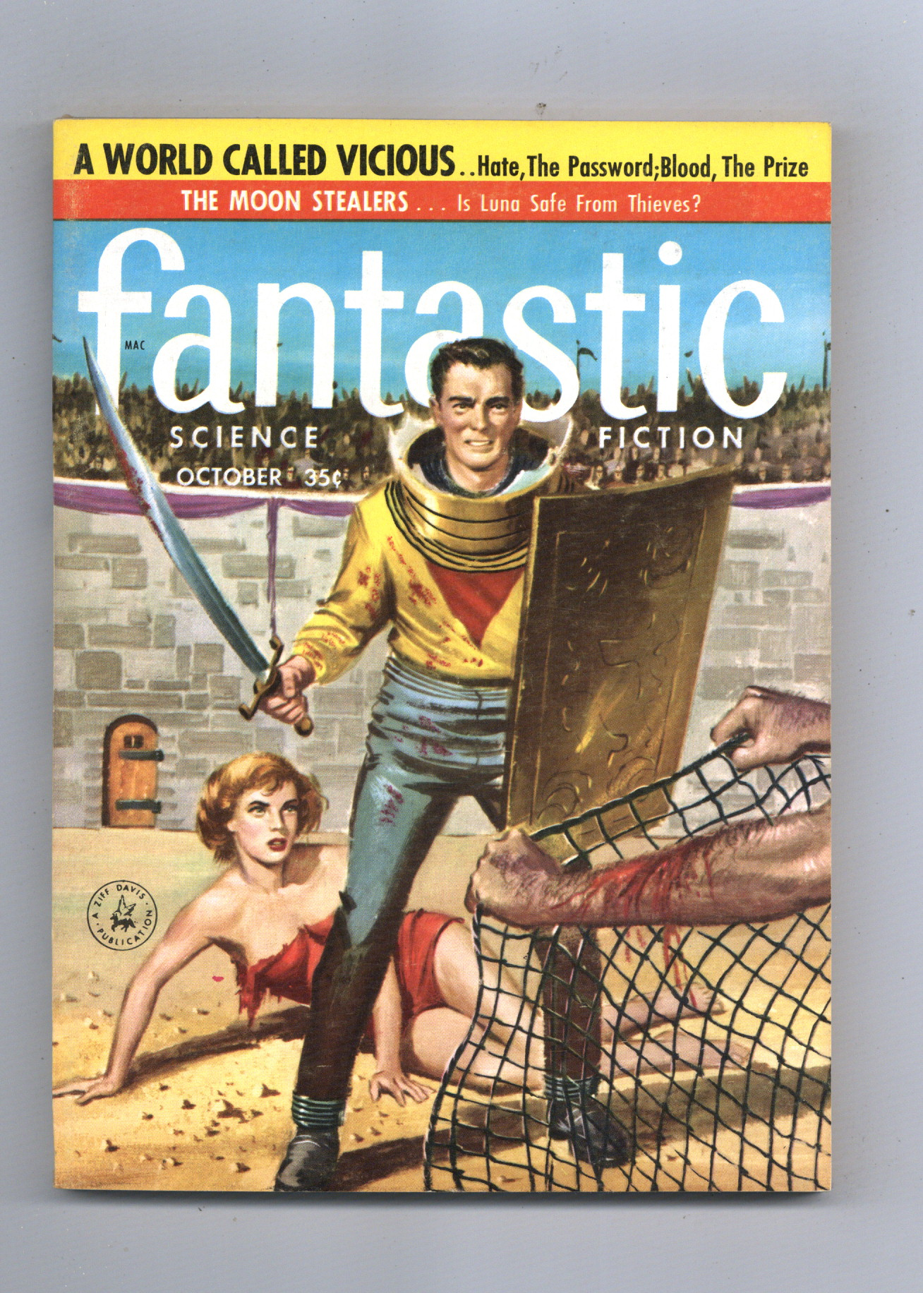 October 1957. Science fiction and fantasy stories by Henry Slater, Robert Silverberg, Ralph Burke, Stanley Mullen, Calvin Knox, and Hall Thornton. Virgil Finlay illustration. Cover by Edward Valigursky. 5.5-in. x 7.75-in.; black and white; 128 newsprint pages. Cover price $0.35.