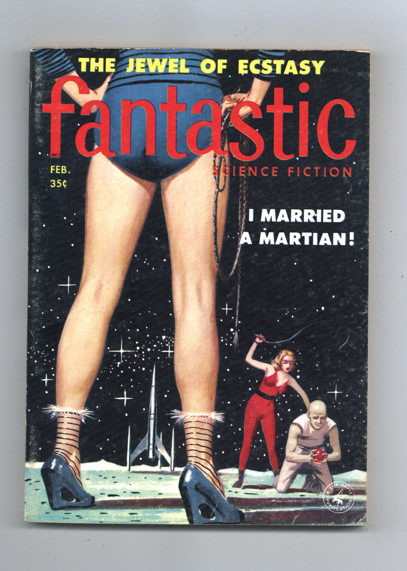 Published Feb 1958 by Ziff Davis.$17.00February 1958. Science fiction and fantasy stories by Henry Slater, Robert Silverberg, Ralph Burke, Stanley Mullen, Calvin Knox, and Hall Thornton. Virgil Finlay illustration. Cover by Edward Valigursky. 5.5-in. x 7.75-in.; black and white; 128 newsprint pages. Cover price $0.35.
