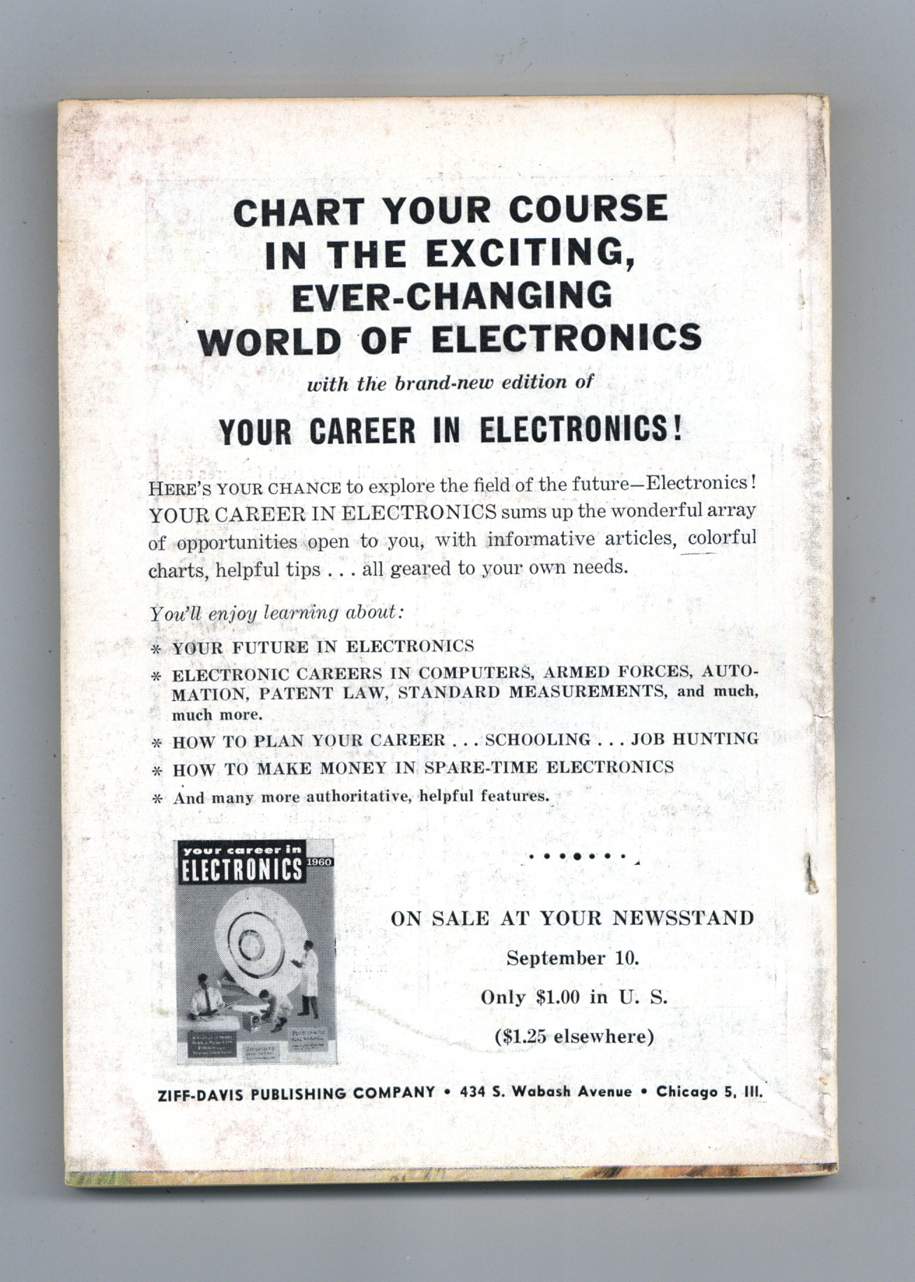 Published Sep 1959 by Ziff Davis.$17.00Cover by Taylor Oughton. Stories by Charles W. Runyon, Mack Reynolds, Jack Sharkey, Phyllis Gotlieb, Henry Slesar, A. Bertram Chandler, Jess Shelton. Illustrations by Leo Summers. 5.5-in. x 7.75-in.; black and white; 130 newsprint pages. Cover price $0.35.