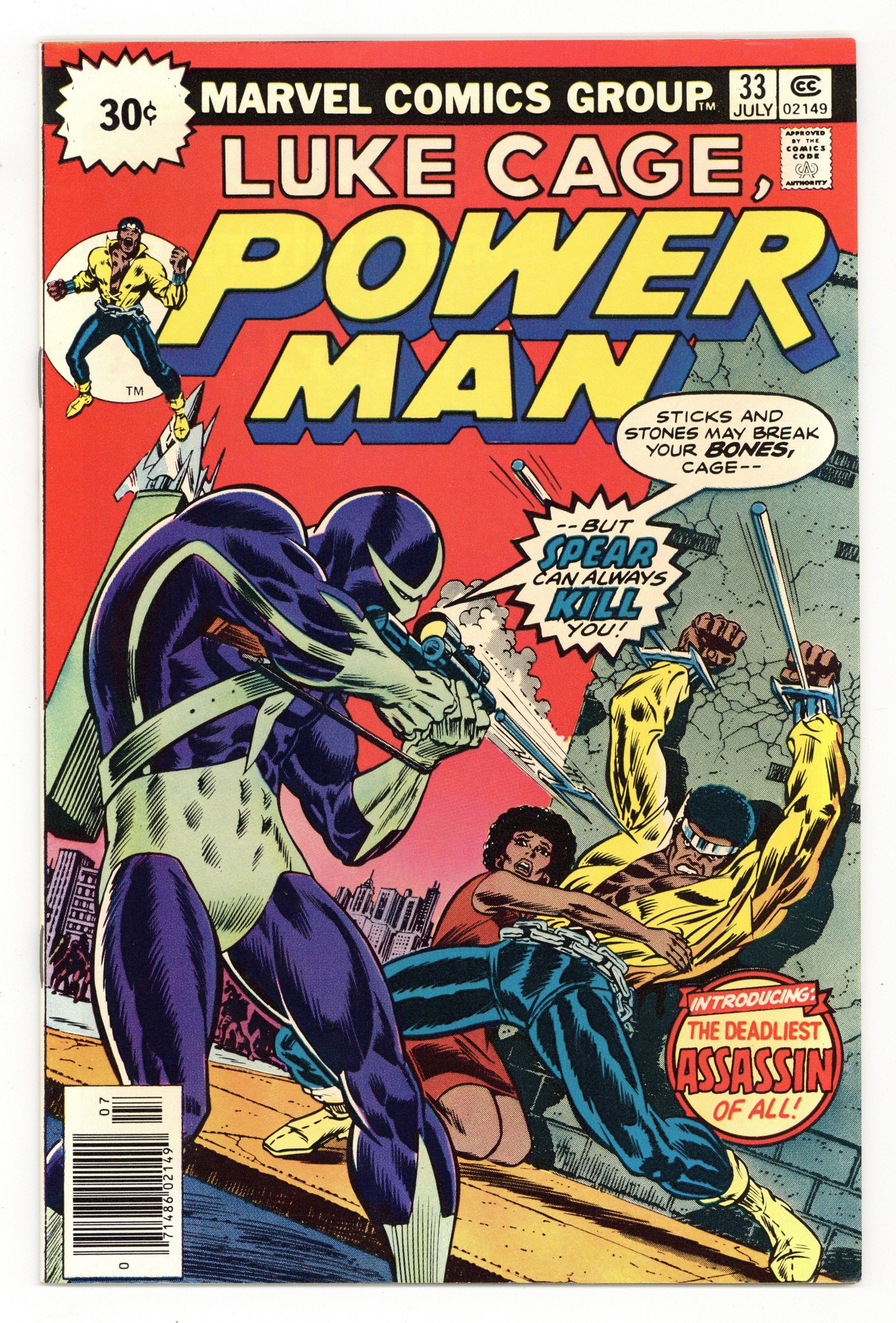 30 Cent Variant, limited distribution. Marvel Value Stamp. "Sticks and Stones will Break your Bones, but Spears will Kill You!" Part 1 of 3. Story by Don McGreggor. Art by Frank Robbins and Vince Colletta. Luke Cage must face off with the deadly assassin simply known as Spear! This killer is gunning for Dr. Rubinstein. Can Power Man save his friend from this tenacious killer of men? Cover price $0.30.