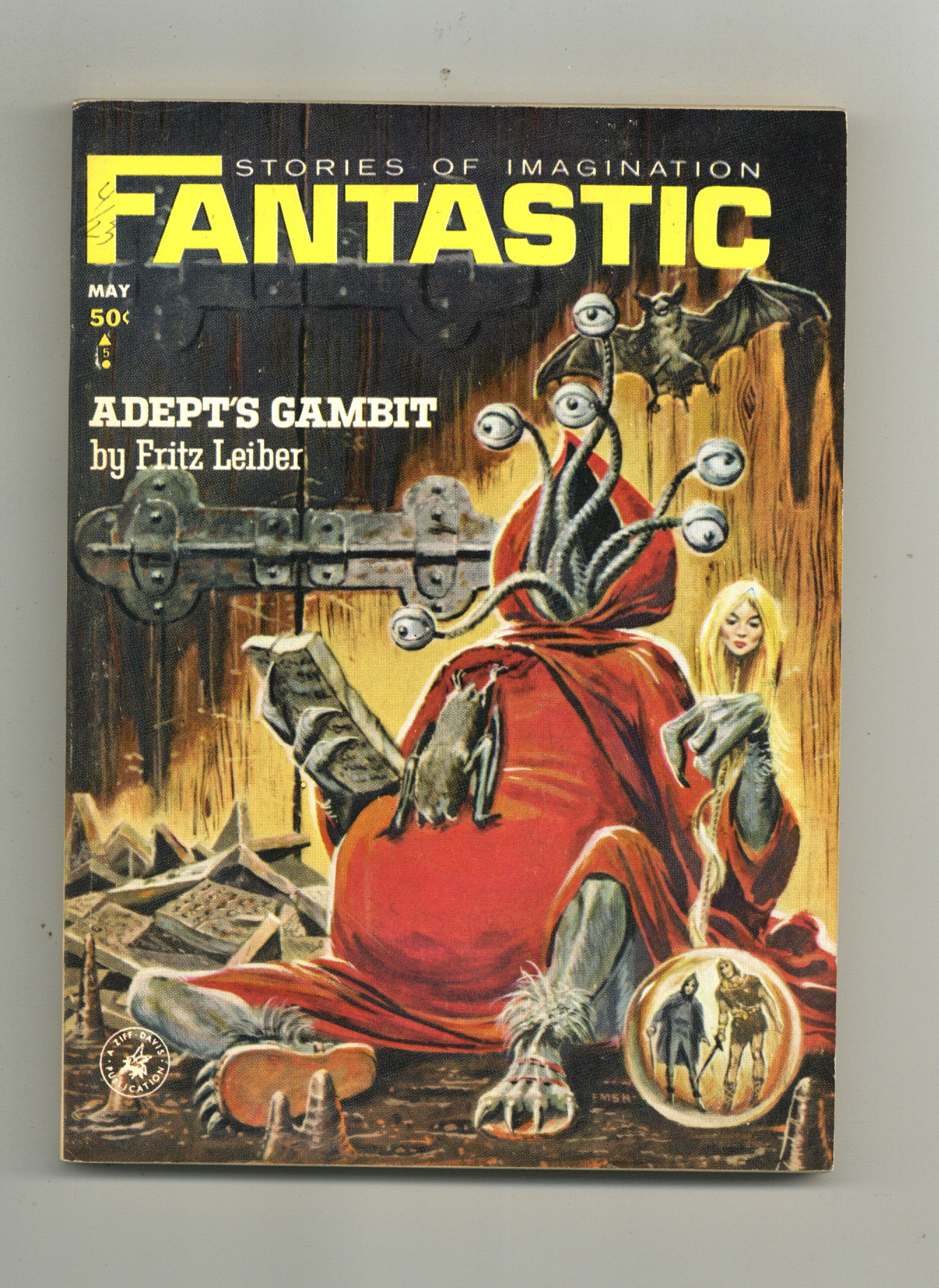 Published May 1964 by Ziff Davis.$8.49Cover by Ed Emshwiller. Stories by Fritz Leiber, Adam Bradford, Leo P. Kelley, Michael Moorcock, David R. Bunch. Illustrations by Emsh, George Schelling, Virgil Finlay, Lutjens, Blair. 5.5-in. x 7.75-in.; black and white; 162 newsprint pages. Cover price $0.50.