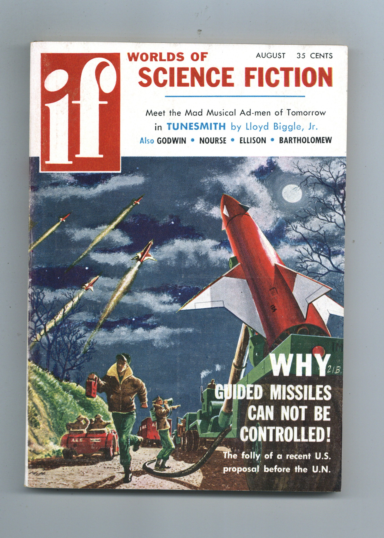 Published Aug 1957 by Quinn Publishing Co..$12.50August 1957. Cover by Mel Hunter. Stories: "Why Guided Missiles Can Not Be Controlled" by "Y", "The Tunesmith" by Lloyd Biggle, Jr., "Wanted In Surgery" by Harlan Ellison, "The Last Victory" by Tom Godwin, "The Birds and the Bees" by Dave E. Fisher, "Bramble Bush" by Alan E. Nourse, "The Bridge" by G. G. Revelle, and "The Last Brave Invader" by Charles L. Fontenay. 5.25-in. x 7.5-in.; 120 Pages, B&W. Cover price $0.35.
