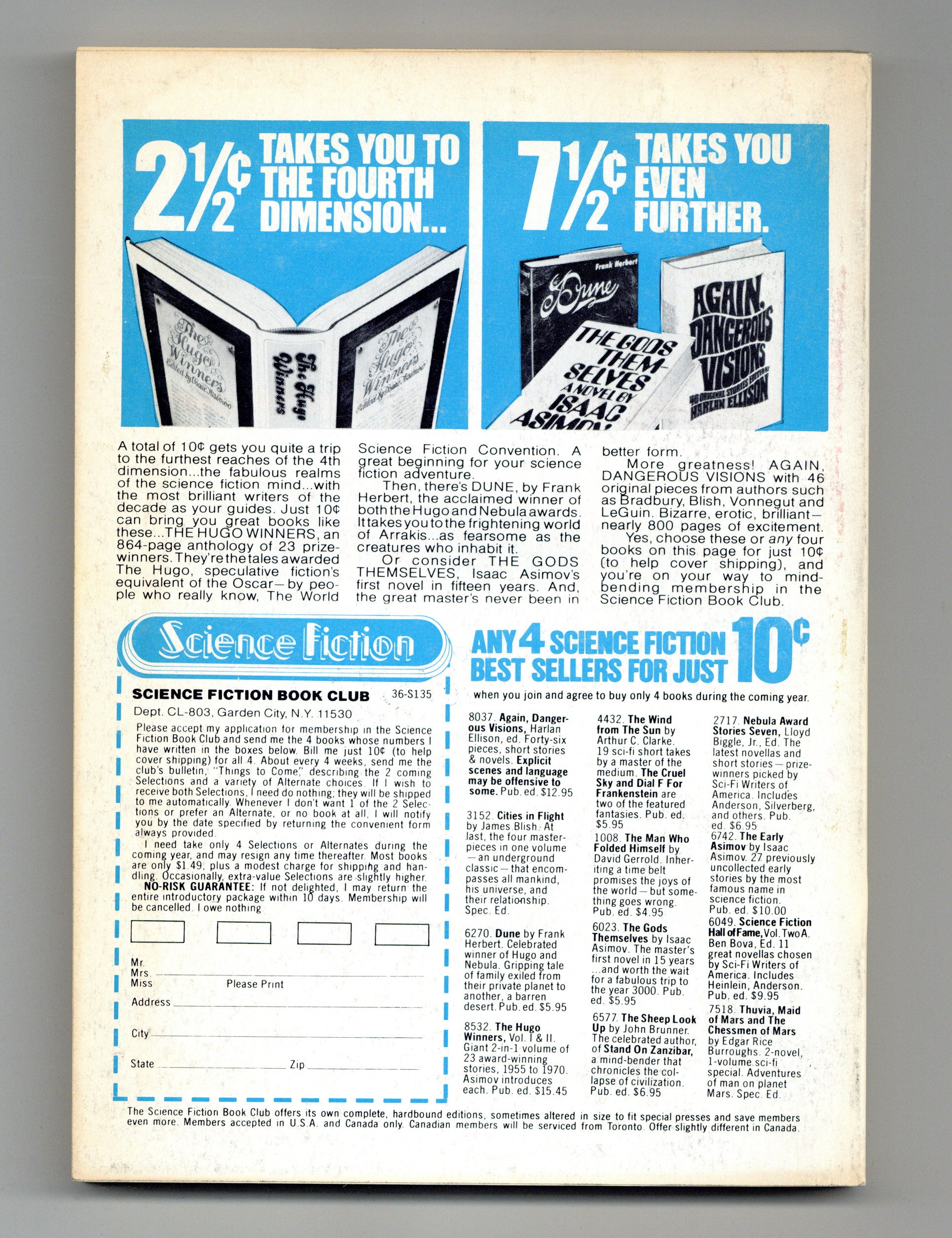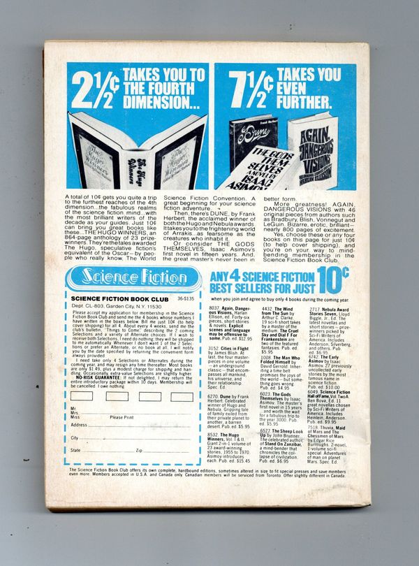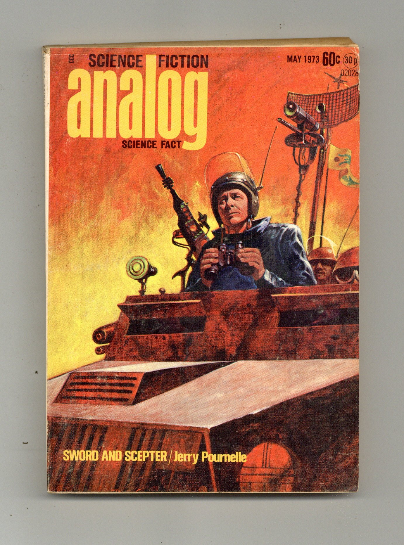 May 1973. Volume Misprinted as XCIII, should be XCI. Cover by Jack Gaughan. Stories: "Sword and Scepter"(Part 1) by Jerry Pournelle, "Naked to the Invisible Eye" by George Alec Effinger, "Survivability" by William Tuning, "How I lost the Second World War and Helped Turn Back the German Invasion" by Gene Wolfe, "With Morning Comes Mistfall" by George R. R. Martin, "An Agent in Place" by Laurence M. Janifer, and "The Great American Economy" by L. E. Modesitt, Jr. Science Fact article: "Minicomputers" by Stephen A. Kallis, Jr. Softcover, 5.5-in. x 7.5-in.; 178 newsprint pages, B&W. Cover price $0.60.